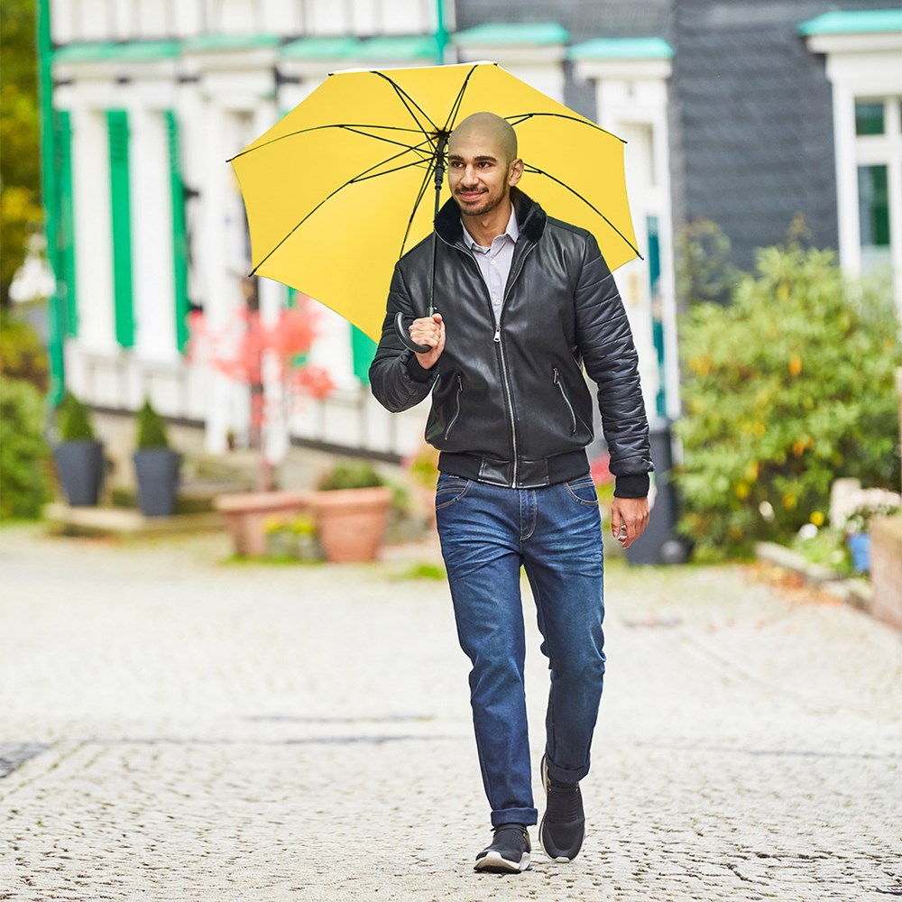 Preislich attraktiver Automatik-Stockschirm mit Windproof-System Komfortable Automatik-Funktion zum schnellen Öffnen, Windproof-System für höhere Gestell-Flexibilität und bessere Windsicherheit, flexible Fiberglasschienen, matt-schwarzer Kunststoff Rundhakengriff, höherer Korrosionsschutz durch schwarze Galvanisierung des Stahlstocks. Auch als Gästeschirm (Art. 2359) erhältlich.