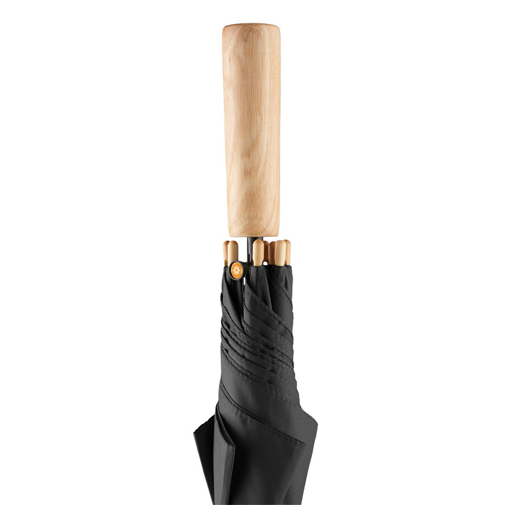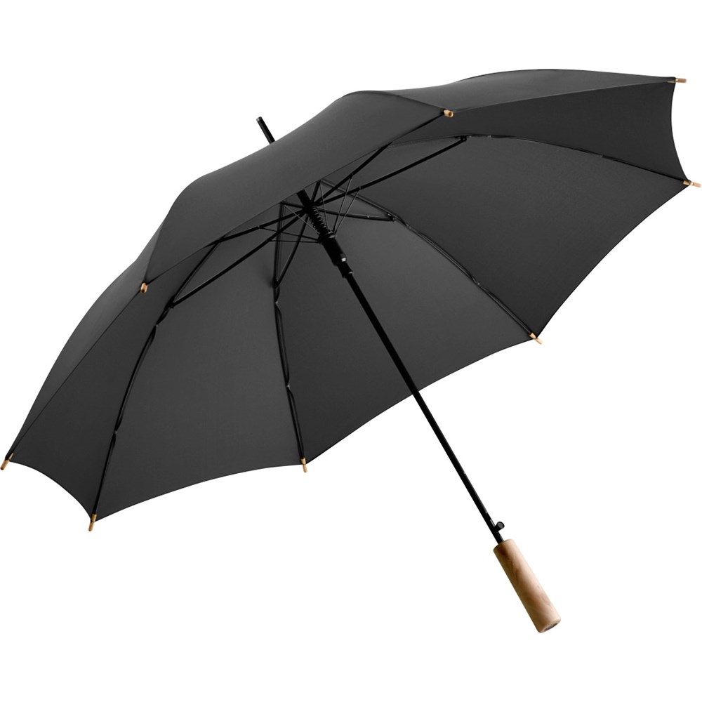 Preislich attraktiver nachhaltiger Stockschirm mit Bezug aus recycelten Kunststoffen und Echtholzelementen Komfortable Automatik-Funktion zum schnellen Öffnen, Windproof-System für höhere Gestell-Flexibilität und bessere Windsicherheit, flexible Fiberglasschienen, Polyester-Pongee Bezugsmaterial aus recycelten Kunststoffen, farbabhängig auch mit waterSAVE®-Bezugmaterial und mit waterSAVE®-Label auf dem Schließband erhältlich, Echtholz-Spitzen, gerader Echtholzgriff mit Werbeanbringungsmöglichkeit, höherer Korrosionsschutz durch schwarze Galvanisierung des Stahlstocks