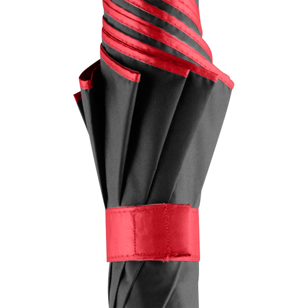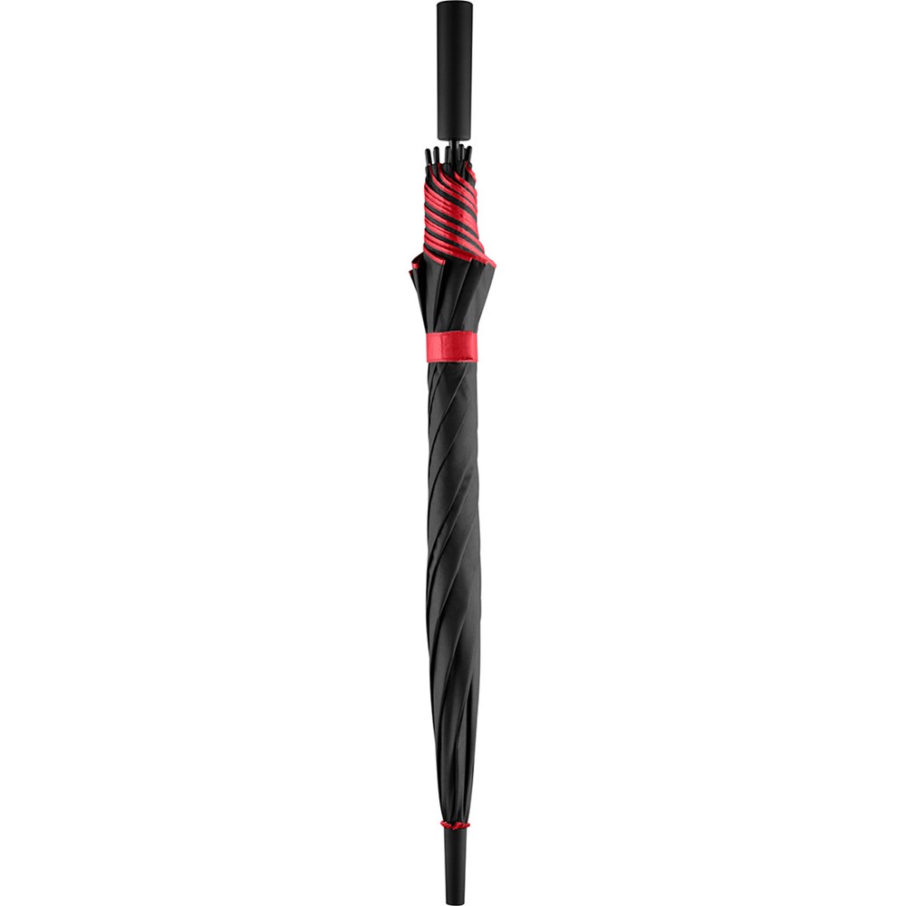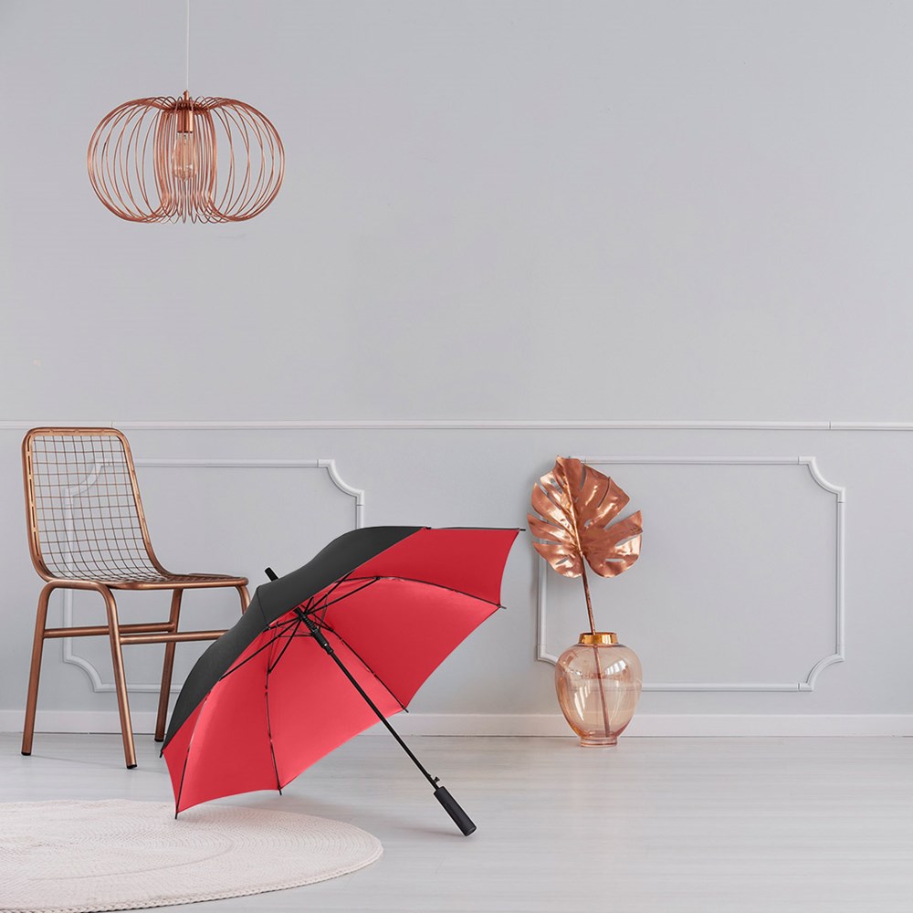 Attraktiver Stockschirm mit zweifarbigem Bezug Komfortable Automatik-Funktion zum schnellen Öffnen, Windproof-System für höhere Gestell-Flexibilität und bessere Windsicherheit, flexible Fiberglasschienen, harmonisch kombinierter zweifarbiger Bezug mit aufeinander abgestimmten Innen- und Außenfarben, Saum, Rosette und Schließband farblich auf Bezug-Innenfarbe angepasst, von innen beschichteter Bezug, gerader Soft-Touch-Griff mit doppelter Werbeanbringungsmöglichkeit, höherer Korrosionsschutz durch schwarze Galvanisierung des Stahlstocks. Auch als Taschenschirm (Art. 5529) erhältlich.