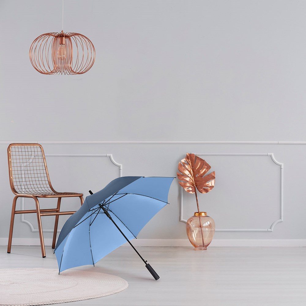Attraktiver Stockschirm mit zweifarbigem Bezug Komfortable Automatik-Funktion zum schnellen Öffnen, Windproof-System für höhere Gestell-Flexibilität und bessere Windsicherheit, flexible Fiberglasschienen, harmonisch kombinierter zweifarbiger Bezug mit aufeinander abgestimmten Innen- und Außenfarben, Saum, Rosette und Schließband farblich auf Bezug-Innenfarbe angepasst, von innen beschichteter Bezug, gerader Soft-Touch-Griff mit doppelter Werbeanbringungsmöglichkeit, höherer Korrosionsschutz durch schwarze Galvanisierung des Stahlstocks. Auch als Taschenschirm (Art. 5529) erhältlich.