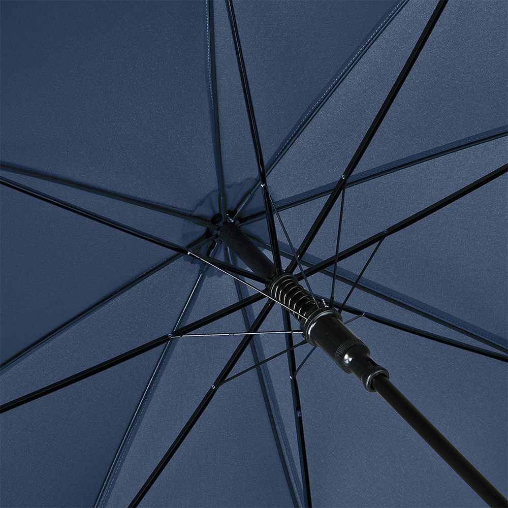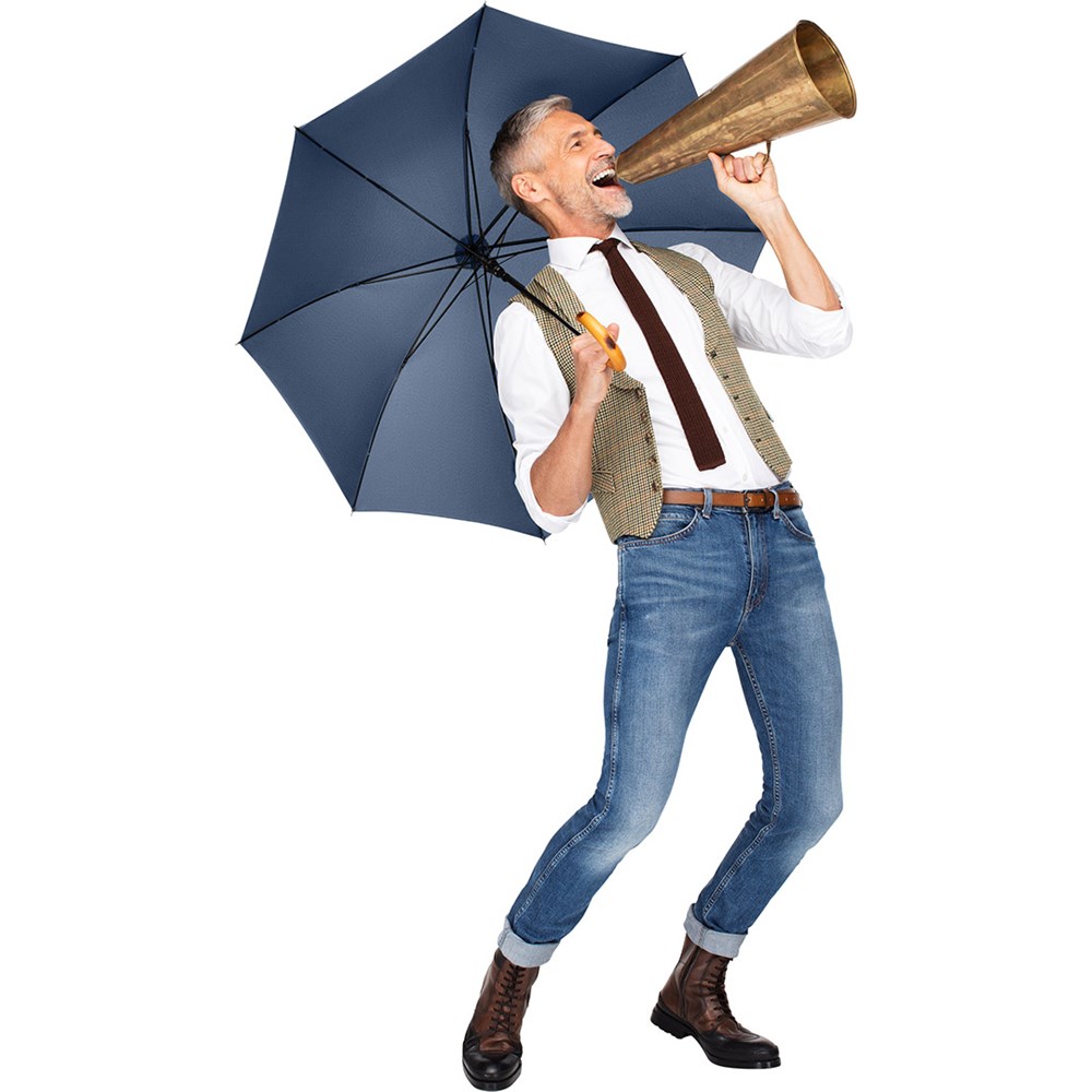 Preislich attraktiver Automatik-Stockschirm mit geflammtem Rundhakengriff aus Echtholz Komfortable Automatik-Funktion zum schnellen Öffnen, Windproof-System für höhere Gestell-Flexibilität und bessere Windsicherheit, flexible Fiberglasschienen, Griff mit laserfähigem Griffring, höherer Korrosionsschutz durch schwarze Galvanisierung des Stahlstocks