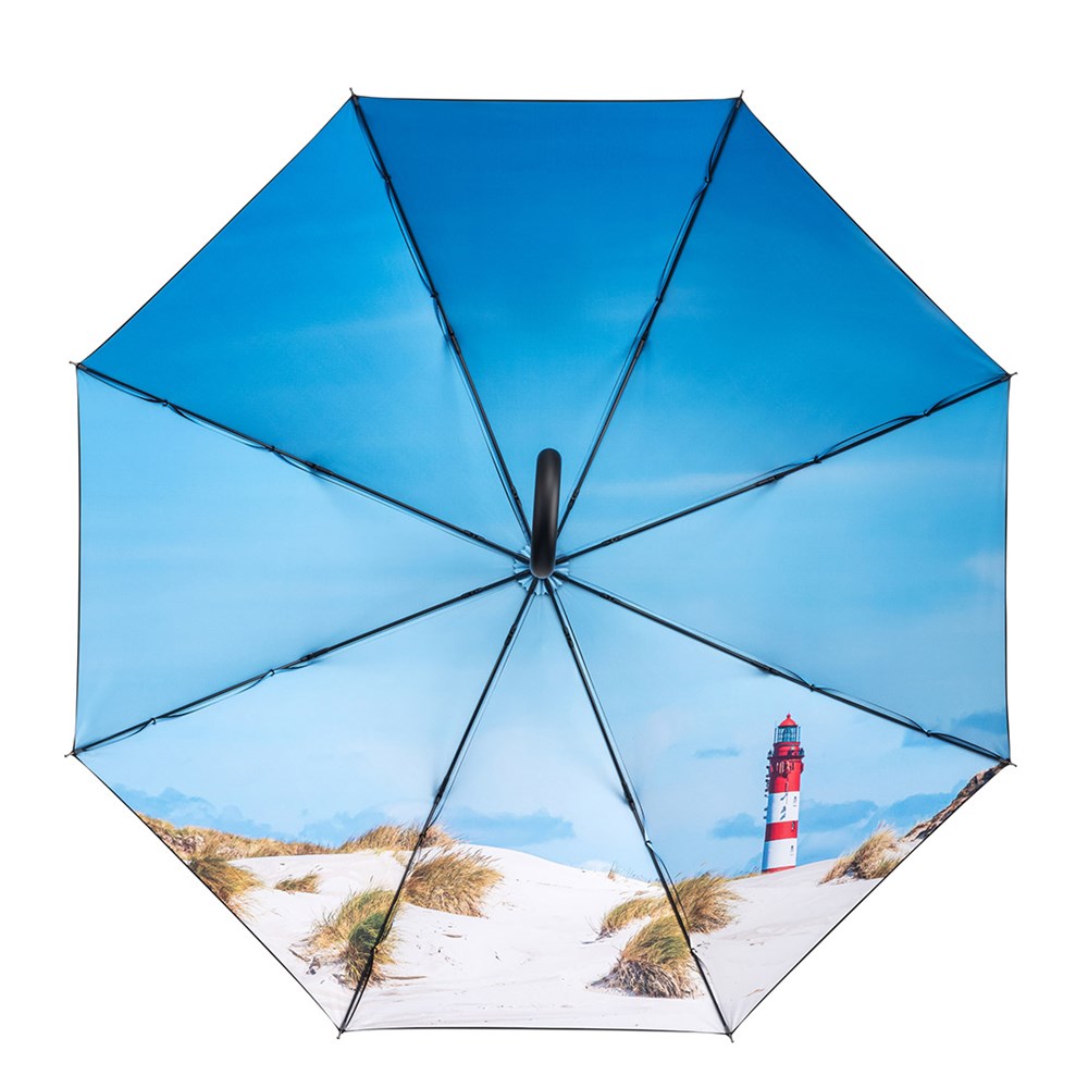 Neutraler Automatik-Stockschirm mit farbigem Motiv-Innendruck Komfortable Automatik-Funktion zum schnellen Öffnen, hochwertiges Windproof-PLUS-System für eine maximale Gestell-Flexibilität bei stärkeren Windböen, flexible Fiberglasschienen, von außen beschichteter Bezug mit Transferdruck innen, Soft-Touch-Rundhakengriff mit integrierter Auslösetaste und Werbeanbringungsmöglichkeit, höherer Korrosionsschutz durch schwarze Galvanisierung des Stahlstocks. Einige Farben auch als Taschenschirm (Art. 5593) erhältlich.
