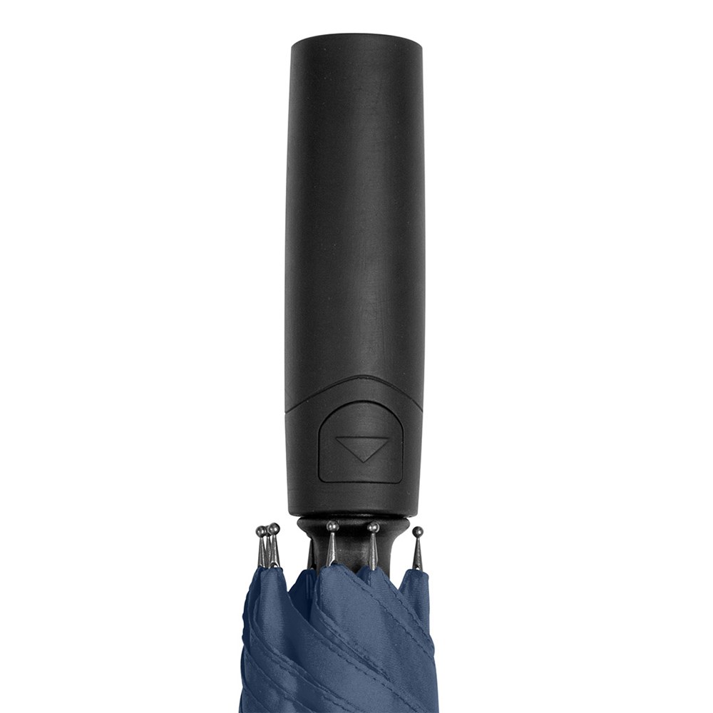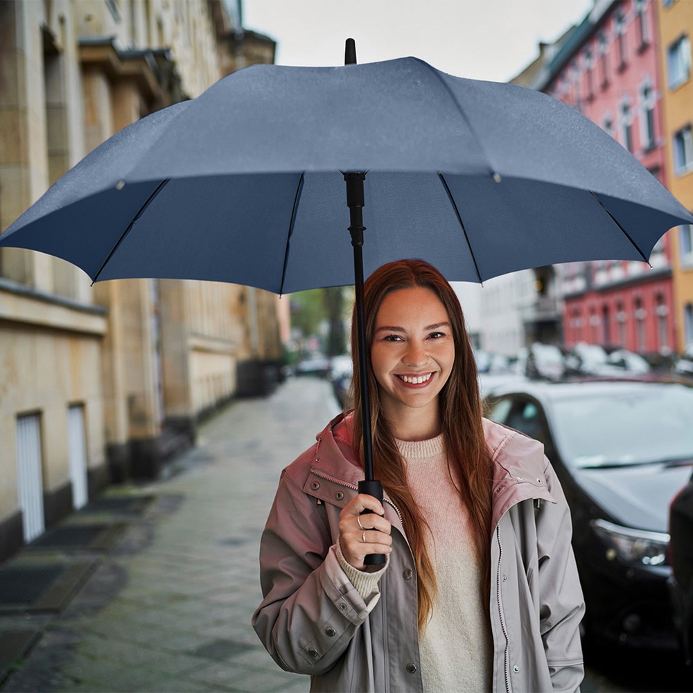 Preislich attraktiver Automatik-Stockschirm mit Windproof-PLUS-System Komfortable Automatik-Funktion zum schnellen Öffnen, hochwertiges Windproof-PLUS-System für eine maximale Gestell-Flexibilität bei stärkeren Windböen, flexible Fiberglasschienen, höherer Korrosionsschutz durch schwarze Galvanisierung des Stahlstocks, handsympathischer Soft-Feel-Griff mit integrierter Auslösetaste und Werbeanbringungsmöglichkeit.