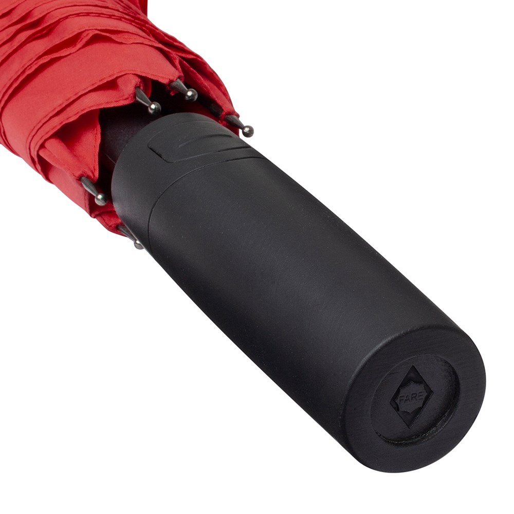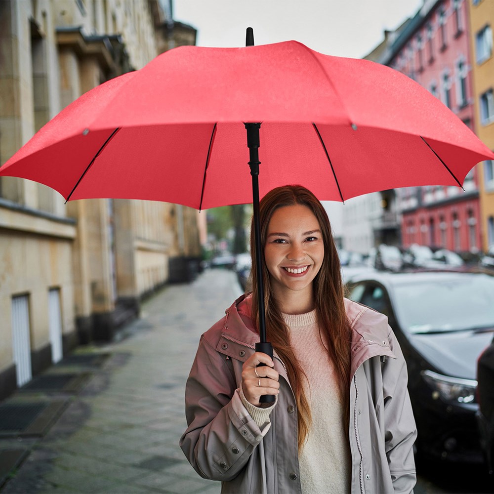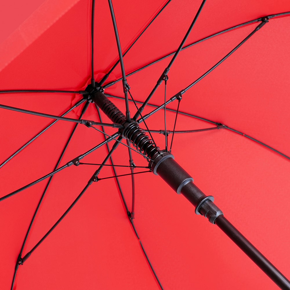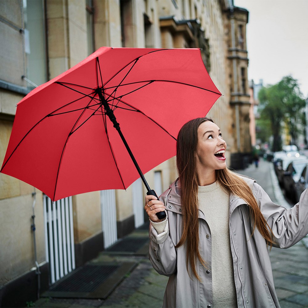 Preislich attraktiver Automatik-Stockschirm mit Windproof-PLUS-System Komfortable Automatik-Funktion zum schnellen Öffnen, hochwertiges Windproof-PLUS-System für eine maximale Gestell-Flexibilität bei stärkeren Windböen, flexible Fiberglasschienen, höherer Korrosionsschutz durch schwarze Galvanisierung des Stahlstocks, handsympathischer Soft-Feel-Griff mit integrierter Auslösetaste und Werbeanbringungsmöglichkeit.