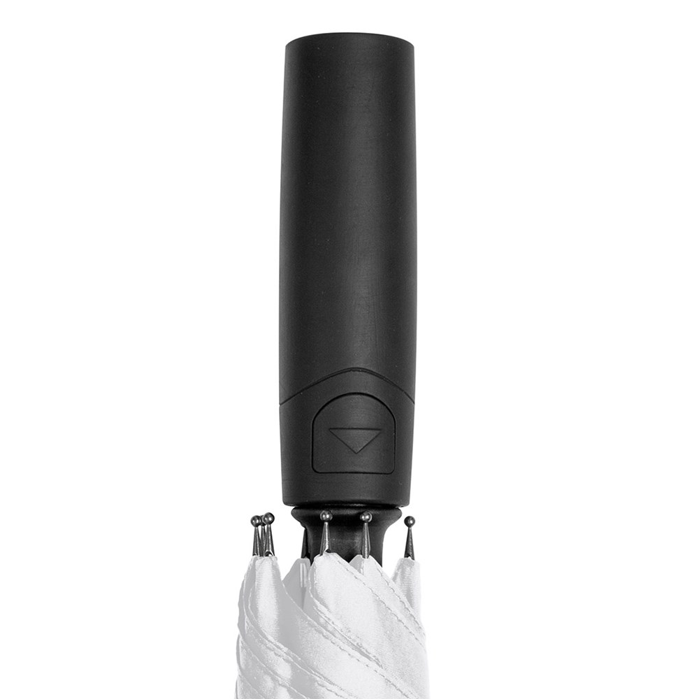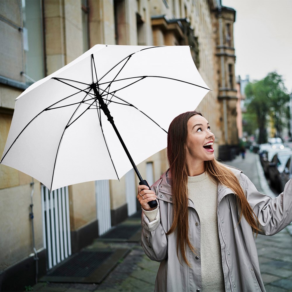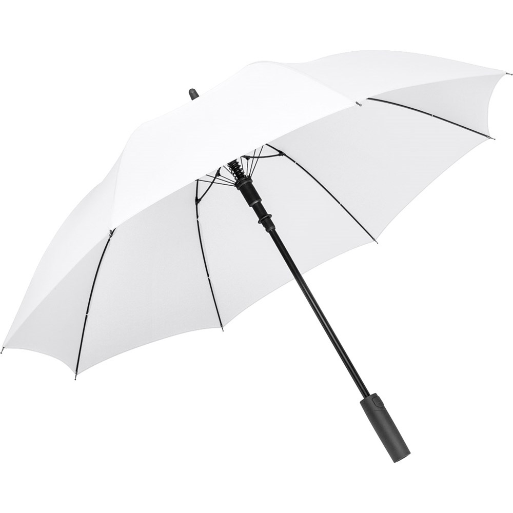 Preislich attraktiver Automatik-Stockschirm mit Windproof-PLUS-System Komfortable Automatik-Funktion zum schnellen Öffnen, hochwertiges Windproof-PLUS-System für eine maximale Gestell-Flexibilität bei stärkeren Windböen, flexible Fiberglasschienen, höherer Korrosionsschutz durch schwarze Galvanisierung des Stahlstocks, handsympathischer Soft-Feel-Griff mit integrierter Auslösetaste und Werbeanbringungsmöglichkeit.