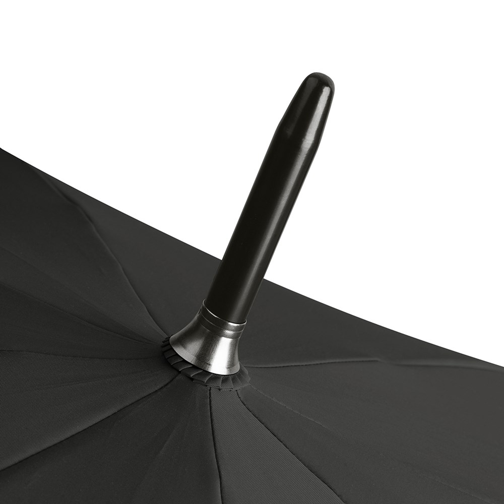 Preislich attraktiver nachhaltiger Gästeschirm mit Bezug aus recycelten Kunststoffen und Echtholzelementen Komfortable Automatik-Funktion zum schnellen Öffnen, hochwertiges Windproof-PLUS-System für eine maximale Gestell-Flexibilität bei stärkeren Windböen, flexible Fiberglasschienen, wassersparend gefärbtes Polyester-Pongee waterSAVE® Bezugsmaterial aus recycelten Kunststoffen, mit waterSAVE®-Label auf dem Schließband, Echtholzspitzen, gerader Echtholzgriff mit Werbeanbringungsmöglichkeit, höherer Korrosionsschutz durch schwarze Galvanisierung des Stahlstocks
