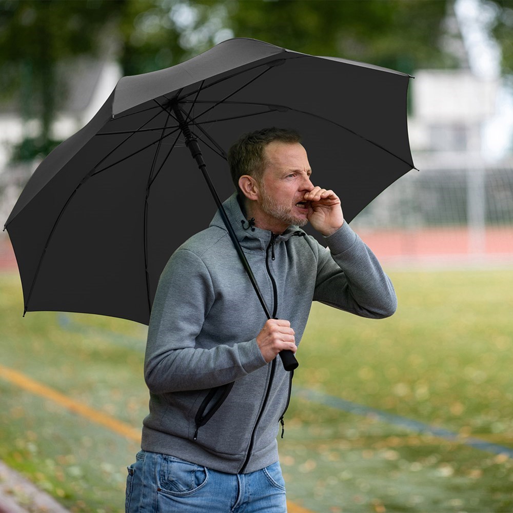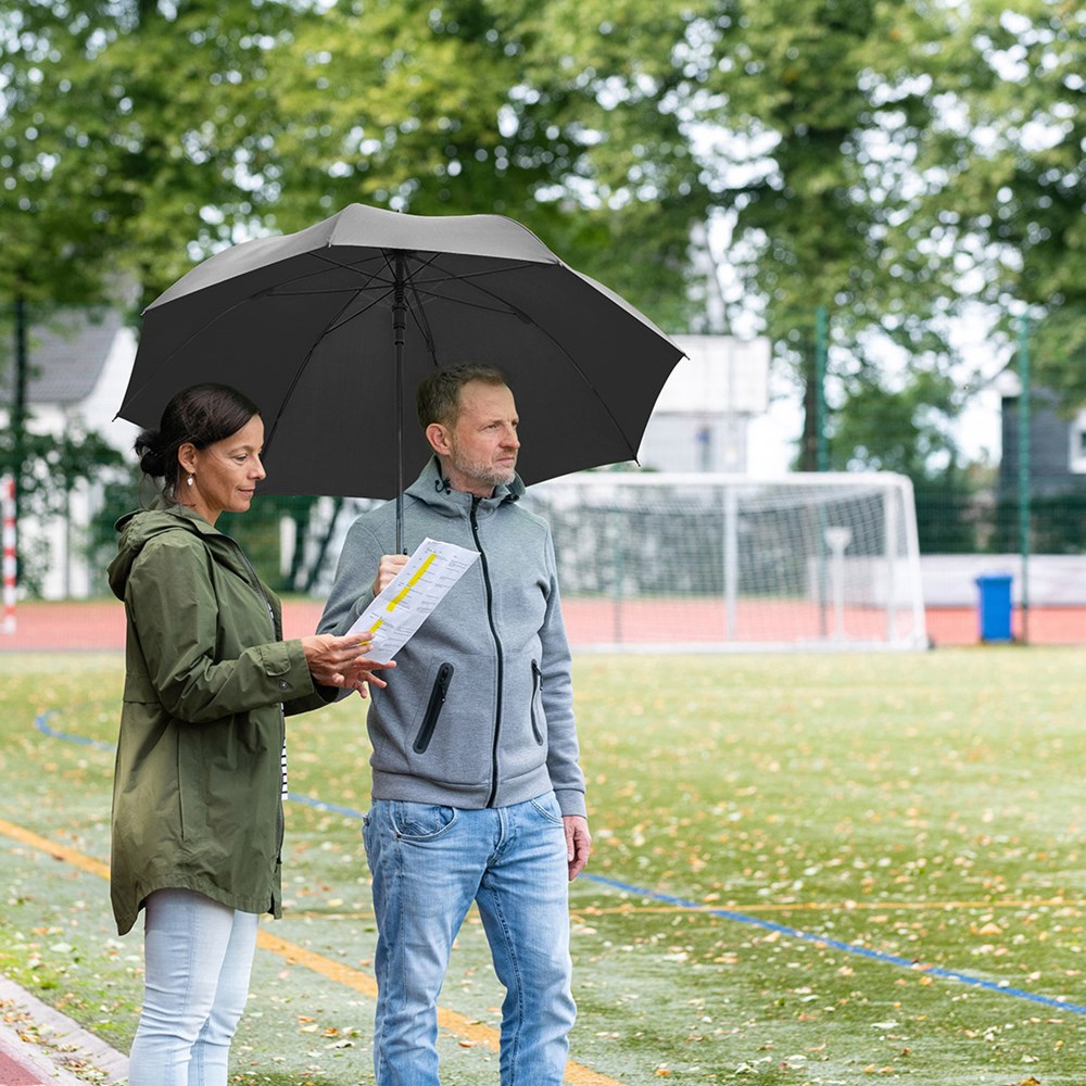 Komfortabler Automatik-Gästeschirm für zwei Personen mit handsympathischem Softgriff Komfortable Automatik-Funktion zum schnellen Öffnen, höhere Gestell-Flexibilität und bessere Windsicherheit durch Windproof-System, flexible Fiberglasschienen, gerader Softgriff, höherer Korrosionsschutz durch schwarze Galvanisierung des Stahlstocks, gastfreundlicher großer Durchmesser