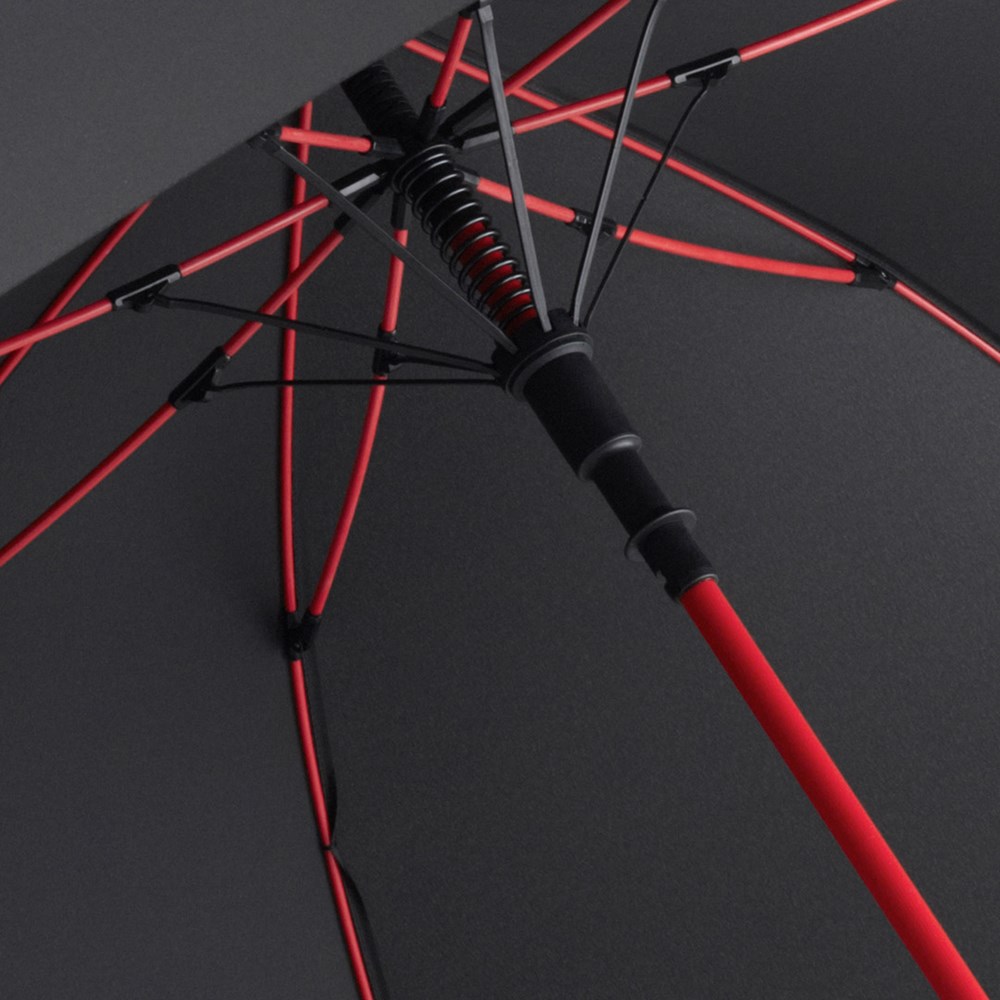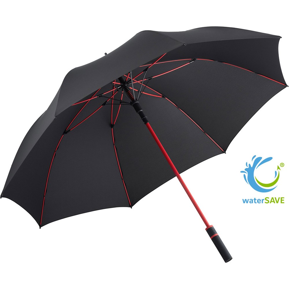 Stylischer Automatik-Gästeschirm für zwei Personen mit farbigem Stock und farbigen Elementen Komfortable Automatik-Funktion zum schnellen Öffnen, hochwertiges Windproof-PLUS-System für eine maximale Gestell-Flexibilität bei stärkeren Windböen, flexible Fiberglasschienen, stabiler Stahlstock mit farbiger Kunststoffummantelung, Polyester-Pongee Bezugsmaterial aus recycelten Kunststoffen, umweltfreundlich dank original waterSAVE Bezugsmaterial, mit waterSAVE®-Label auf dem Schließband, exklusiver gerader Soft-Feel-Griff mit farbigen Griffringen und doppelter Werbeanbringungsmöglichkeit. Auch als Taschenschirm (Art. 5084, 5484, 5584) und Midsize-Schirm (Art. 4784) erhältlich.