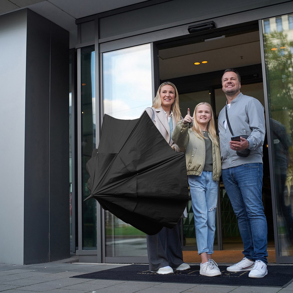 Exklusiver Automatik-Gästeschirm für zwei Personen mit Tropfenmotiv auf dem Fiberglasstock Komfortable Automatik-Funktion zum schnellen Öffnen, hochwertiges Windproof-PLUS-System für eine maximale Gestell-Flexibilität bei stärkeren Windböen, flexible Fiberglasschienen, stabiler Fiberglasstock mit Tropfenmotiv, wassersparend gefärbtes Polyester-Pongee waterSAVE® Bezugsmaterial aus recycelten Kunststoffen, mit waterSAVE® Label auf dem Schließband (bei neuen Chargen), von innen beschichteter Bezug, überlappender Ventilationsbezug zur Regulierung von Überdruck durch stärkere Windböen, gerader Softgriff mit farbigen Griffringen, integrierter Auslösetaste und Werbeanbringungsmöglichkeit, Tropfenmotiv und Griffringe farblich auf den Bezug abgestimmt