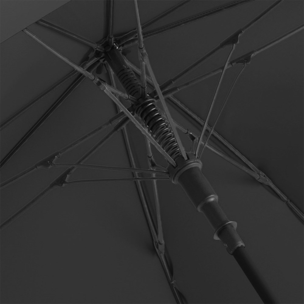 Quadratischer Gästeschirm für zwei Personen Komfortable Automatik-Funktion zum schnellen Öffnen, hochwertiges Windproof-PLUS-System für eine maximale Gestell-Flexibilität bei stärkeren Windböen, flexible Fiberglasschienen, farbige Ummantelung des Stahlstocks, gerader Soft-Touch-Griff mit integrierter Auslösetaste und doppelter Werbeanbringungsmöglichkeit, gastfreundlicher großer Durchmesser