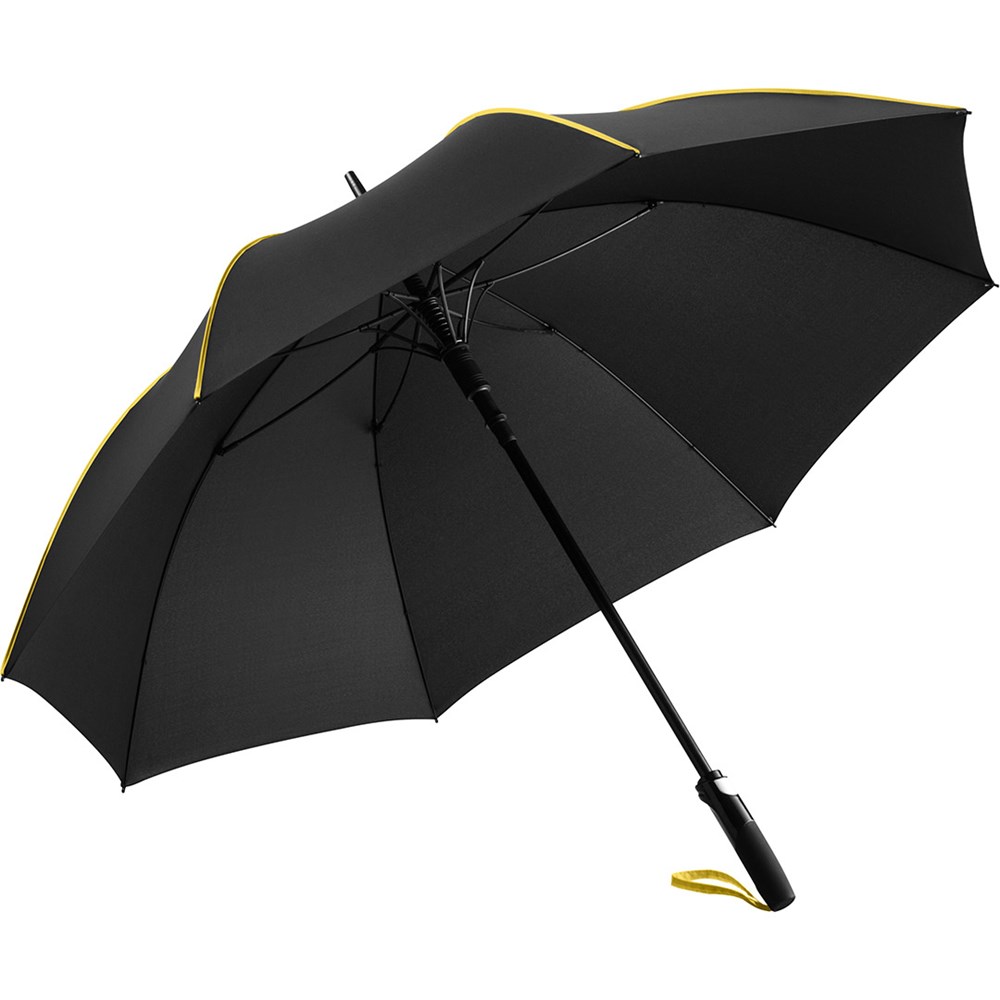 Schicker Automatik-Stockschirm in mittlerer Größe mit farbigen Highlights Komfortable Automatik-Funktion zum schnellen Öffnen, hochwertiges Windproof-PLUS-System für eine maximale Gestell-Flexibilität bei stärkeren Windböen, flexible Fiberglasschienen, auffällige Verzierung des Bezugs durch farbige Segmentnahtpaspeln, matt/glänzend abgesetzter Soft-Touch-Griff mit integrierter Auslösetaste und Werbeanbringungsmöglichkeit, farbige Griffschlaufe, höherer Korrosionsschutz durch schwarze Galvanisierung des Stahlstocks. Auch als Taschenschirm (Art. 5639) erhältlich.