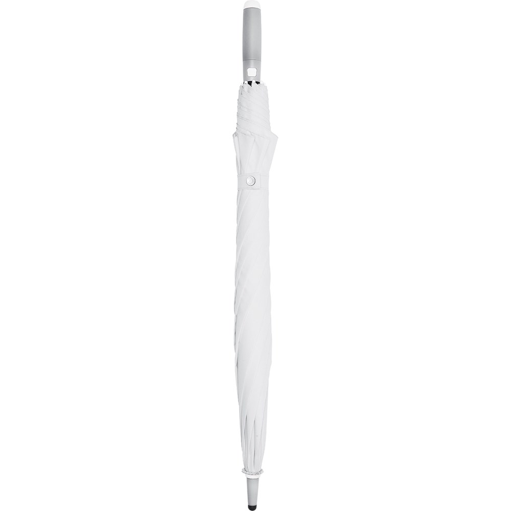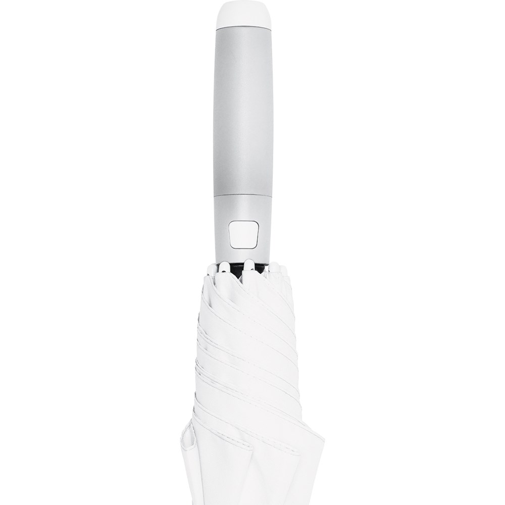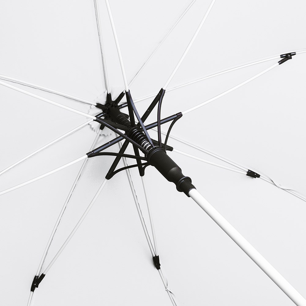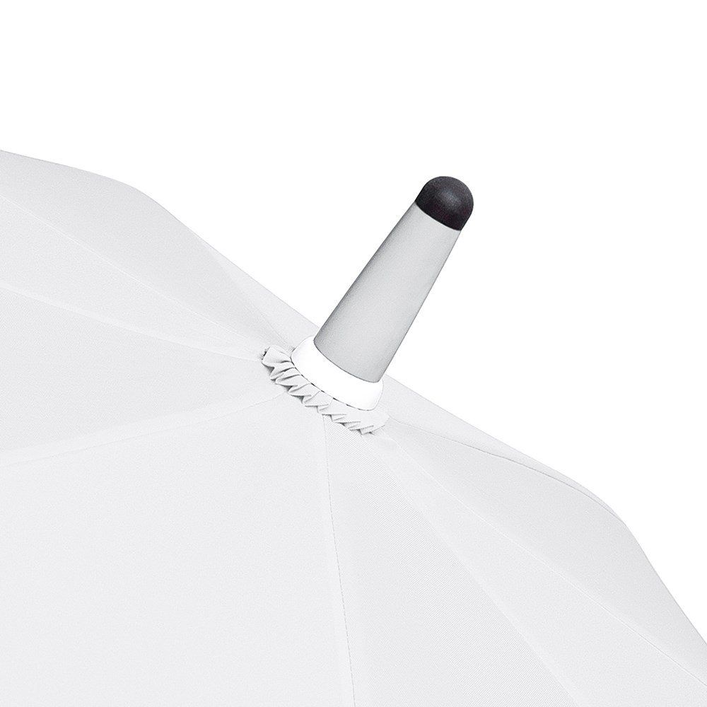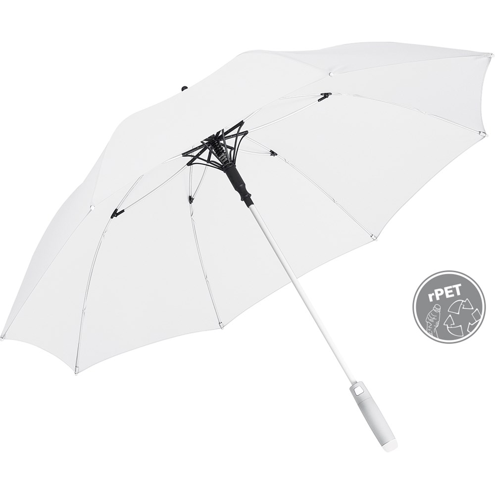 Stylischer Automatik-Stockschirm in mittlerer Größe mit weißem Stock, Schienen und Kunststoff-Spitzen Komfortable Automatik-Funktion zum schnellen Öffnen, hochwertiges Windproof-PLUS-System für eine maximale Gestell-Flexibilität bei stärkeren Windböen, flexible Fiberglasschienen in weiß, stabiler Stahlstock mit weißer Kunststoffummantelung, Polyester-Pongee Bezugsmaterial aus recycelten Kunststoffen, weiße Kunststoff-Spitzen, formschöner Soft-Feel-Griff mit integrierter Auslösetaste und Werbeanbringungsmöglichkeit