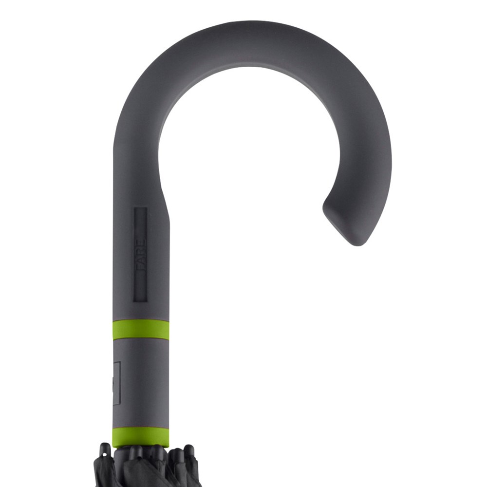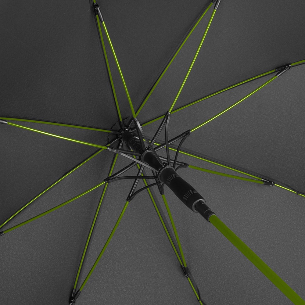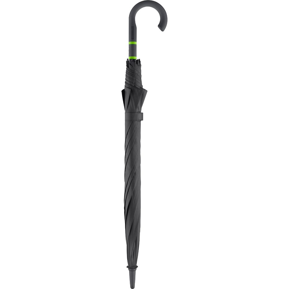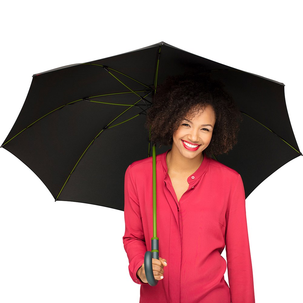 Stylischer Automatik-Stockschirm in mittlerer Größe mit farbigem Stock und farbigen Schienen Komfortable Automatik-Funktion zum schnellen Öffnen, hochwertiges Windproof-PLUS-System für eine maximale Gestell-Flexibilität bei stärkeren Windböen, flexible Fiberglasschienen, stabiler Stahlstock mit farbiger Kunststoffummantelung, Polyester-Pongee Bezugsmaterial aus recycelten Kunststoffen, umweltfreundlich dank original waterSAVE® Bezugsmaterial, mit waterSAVE®-Label auf dem Schließband, formschöner Soft-Feel-Rundhakengriff mit farbigen Griffringen, integrierter Auslösetaste und Werbeanbringungsmöglichkeit. Auch als Taschenschirm (Art. 5084, 5484, 5584) und Gästeschirm (Art. 2384) erhältlich. Ausgezeichnet mit dem Promotional Gift Award 2016.
