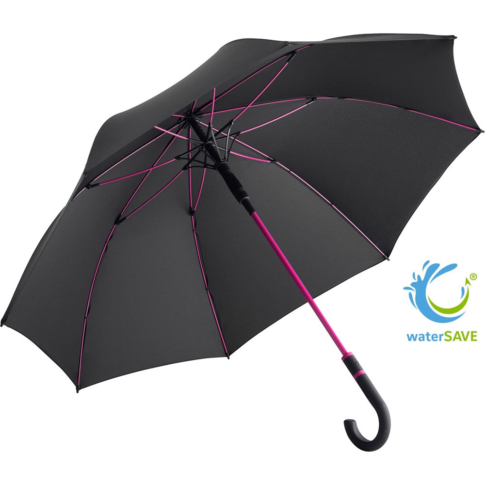 Stylischer Automatik-Stockschirm in mittlerer Größe mit farbigem Stock und farbigen Schienen Komfortable Automatik-Funktion zum schnellen Öffnen, hochwertiges Windproof-PLUS-System für eine maximale Gestell-Flexibilität bei stärkeren Windböen, flexible Fiberglasschienen, stabiler Stahlstock mit farbiger Kunststoffummantelung, Polyester-Pongee Bezugsmaterial aus recycelten Kunststoffen, umweltfreundlich dank original waterSAVE® Bezugsmaterial, mit waterSAVE®-Label auf dem Schließband, formschöner Soft-Feel-Rundhakengriff mit farbigen Griffringen, integrierter Auslösetaste und Werbeanbringungsmöglichkeit. Auch als Taschenschirm (Art. 5084, 5484, 5584) und Gästeschirm (Art. 2384) erhältlich. Ausgezeichnet mit dem Promotional Gift Award 2016.