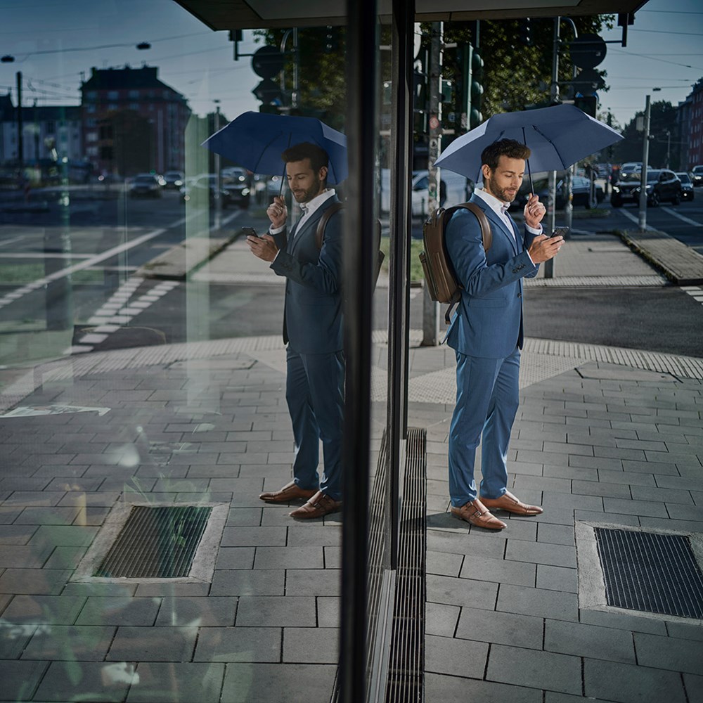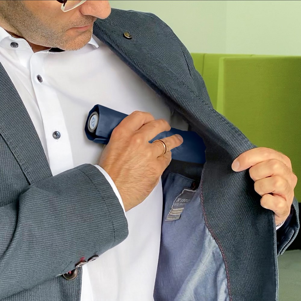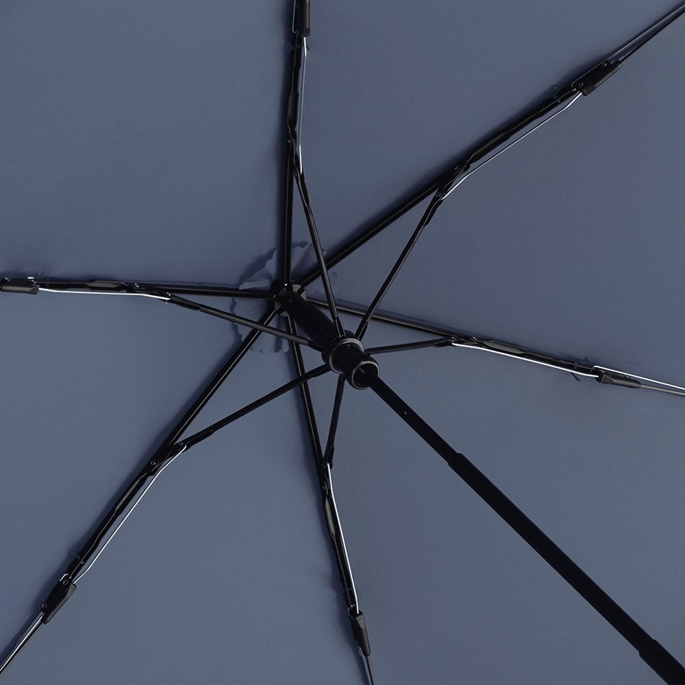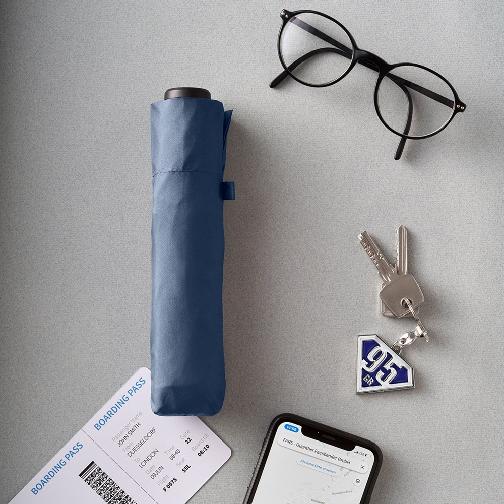 Filigraner Handöffner-Taschenschirm in ultraleichter Ausführung Einfache Handhabung durch Sicherheitsschieber, hochwertiges Windproof-PLUS-System für eine maximale Gestell-Flexibilität bei stärkeren Windböen, schwarzer Aluminiumstock, Polyester-Pongee Bezugsmaterial aus recycelten Kunststoffen, extra leichter Bezug, matt-schwarzer Kunststoffgriff aus recyceltem ABS (rABS) mit Werbeanbringungsmöglichkeit, handtaschentauglich durch ultraleichtes Gewicht und kompakte Größe