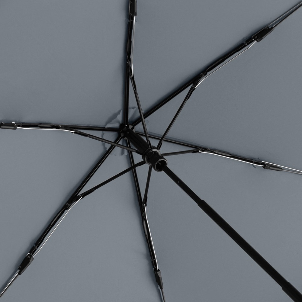 Filigraner Handöffner-Taschenschirm in ultraleichter Ausführung Einfache Handhabung durch Sicherheitsschieber, hochwertiges Windproof-PLUS-System für eine maximale Gestell-Flexibilität bei stärkeren Windböen, schwarzer Aluminiumstock, Polyester-Pongee Bezugsmaterial aus recycelten Kunststoffen, extra leichter Bezug, matt-schwarzer Kunststoffgriff aus recyceltem ABS (rABS) mit Werbeanbringungsmöglichkeit, handtaschentauglich durch ultraleichtes Gewicht und kompakte Größe