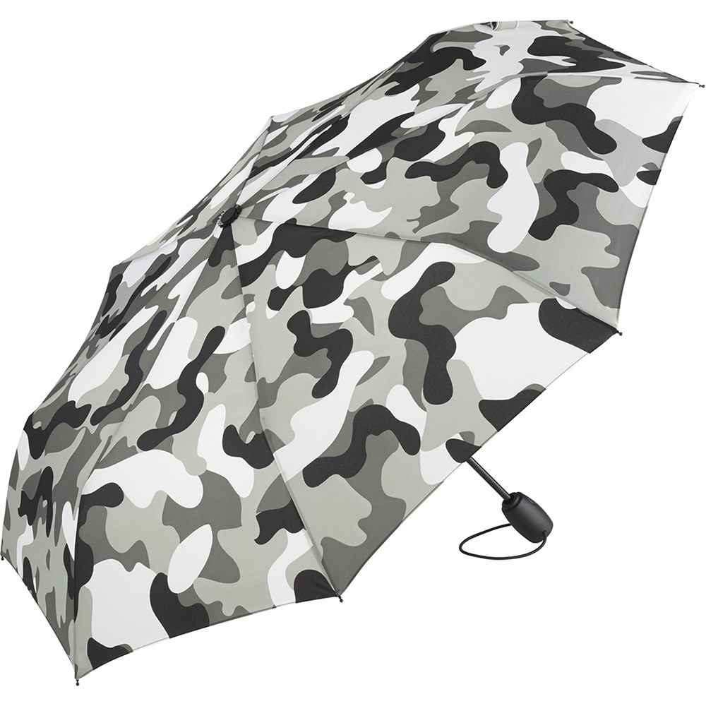 Modischer Doppelautomatik-Taschenschirm mit angesagtem Tarnmuster Komfortable Doppelautomatik-Funktion zum schnellen Öffnen und Schließen, hochwertiges Windproof-PLUS-System für eine maximale Gestell-Flexibilität bei stärkeren Windböen, handsympathischer Soft-Feel-Griff mit integrierter Auslösetaste, elastischer Tragekordel und Werbeanbringungsmöglichkeit, Futteral mit schwarzer Paspelierung. Auch als Stockschirm (Art. 1118) erhältlich.
