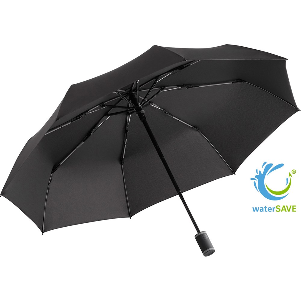 Stylischer Doppelautomatik-Taschenschirm mit farbigen Elementen Komfortable Doppelautomatik-Funktion zum schnellen Öffnen und Schließen, hochwertiges Windproof-PLUS-System für eine maximale Gestell-Flexibilität bei stärkeren Windböen, flexible Fiberglasschienen, Polyester-Pongee Bezugsmaterial aus recycelten Kunststoffen, umweltfreundlich dank original waterSAVE Bezugsmaterial, mit waterSAVE®-Label auf dem Schließband, ansprechendes Design durch farbige Schienen, Griffringe und Nähte, handsympathischer Soft-Feel-Griff mit integrierter Auslösetaste und Werbeanbringungsmöglichkeit, komfortables Futteral mit farbigen Nähten und Tragegurten. Auch als Taschenschirm (Art. 5084, 5584), Midsize-Schirm (Art. 4784) und Gästeschirm (Art. 2384) erhältlich.