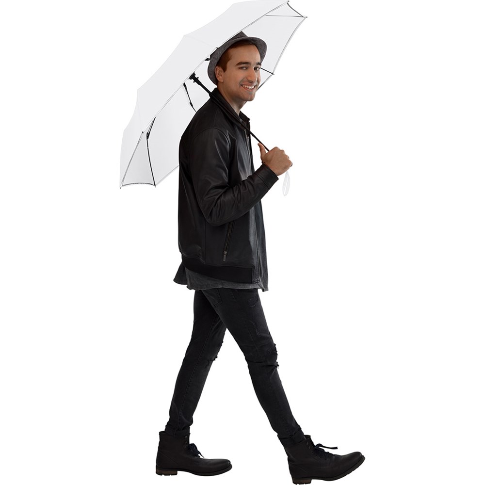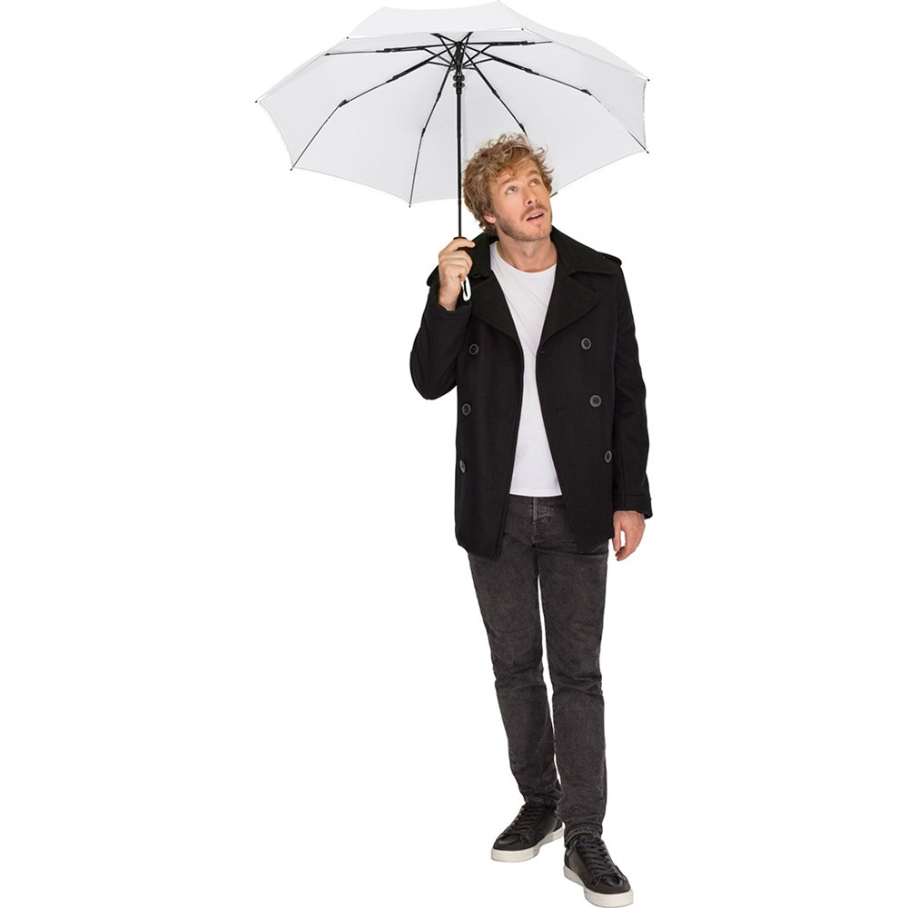 Stabiler Automatik-Taschenschirm mit modisch reflektierender Paspelierung Komfortable Automatik-Funktion zum schnellen Öffnen, hochwertiges Windproof-PLUS-System für eine maximale Gestell-Flexibilität bei stärkeren Windböen, Bezug mit modischer Reflexpaspel in silber, Soft-Touch-Griff mit glänzender Auslösetaste und Werbeanbringungsmöglichkeit, Futteral mit modischer Reflexpaspel
