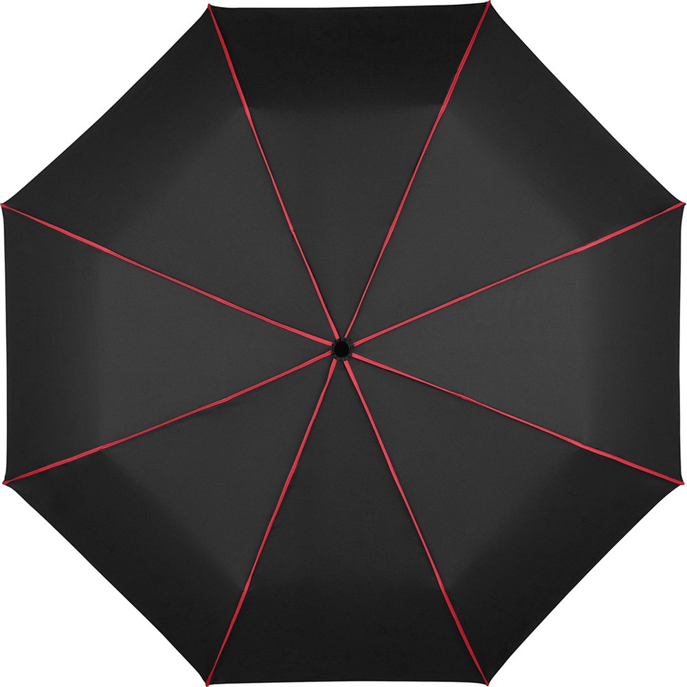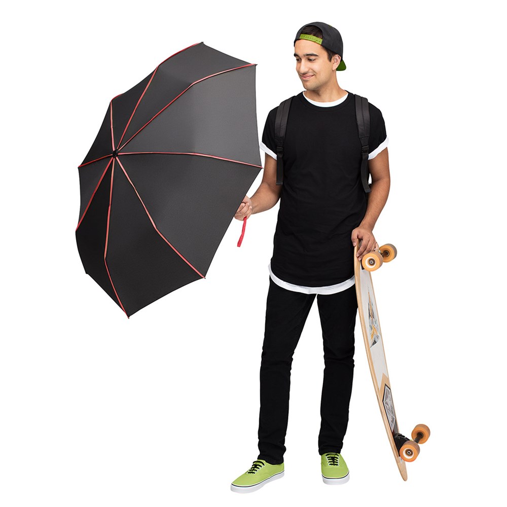 Schicker Doppelautomatik-Taschenschirm in Übergröße mit farbigen Highlights Komfortable Doppelautomatik-Funktion zum schnellen Öffnen und Schließen, hochwertiges Windproof-PLUS-System für eine maximale Gestell-Flexibilität bei stärkeren Windböen, auffällige Verzierung des Bezugs durch farbige Segmentnahtpaspeln, matt / glänzend abgesetzter Soft-Feel-Griff mit integrierter Auslösetaste und Werbeanbringungsmöglichkeit, farbige Griffschlaufe, Futteral mit Druckknopf und farbiger Paspelierung. Auch als Midsize-Schirm (Art. 4399) erhältlich.