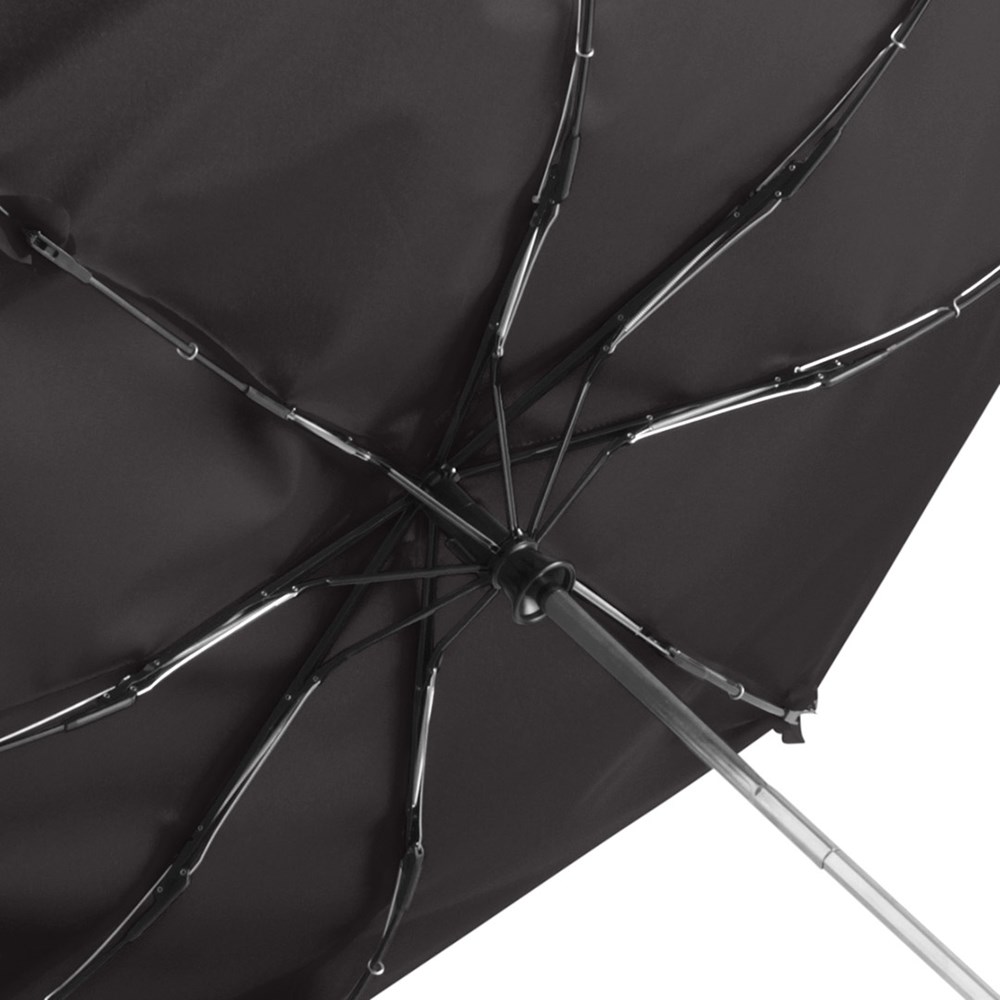 Markanter Doppelautomatik-Taschenschirm in Übergröße mit modisch reflektierender Paspelierung Komfortable Doppelautomatik-Funktion zum schnellen Öffnen und Schließen, hochwertiges Windproof-PLUS-System für eine maximale Gestell-Flexibilität bei stärkeren Windböen, flexible Fiberglasschienen, verchromter Stahlstock, Bezug mit modischer Reflexpaspel in silber, Griff in Alu-Finish mit integrierter Auslösetaste und Werbeanbringungsmöglichkeit