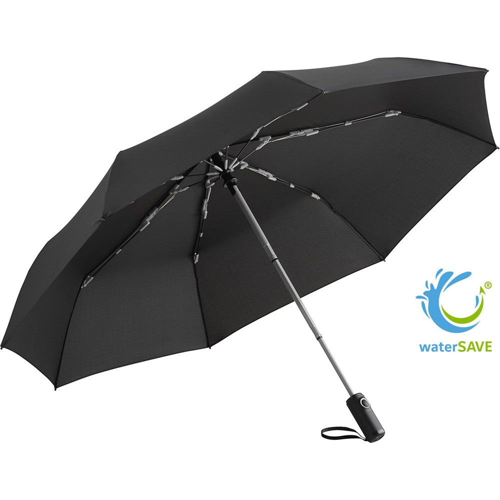 Schicker Doppelautomatik-Taschenschirm in Übergröße mit farbigem Stock und farbigen Gelenken Komfortable Dopppelautomatik-Funktion zum schnellen Öffnen und Schließen, hochwertiges Windproof-PLUS-System für eine maximale Gestell-Flexibilität bei stärkeren Windböen, stabile Fiberglasschienen mit farbigen Gelenken, farbiger Stahlstock, Polyester-Pongee Bezugsmaterial aus recycelten Kunststoffen, umweltfreundlich dank original waterSAVE Bezugsmaterial, mit waterSAVE®-Label auf dem Schließband, matt/glänzend abgesetzter Soft-Feel-Griff mit farbig umrandeter Auslösetaste und Werbeanbringungsmöglichkeit
