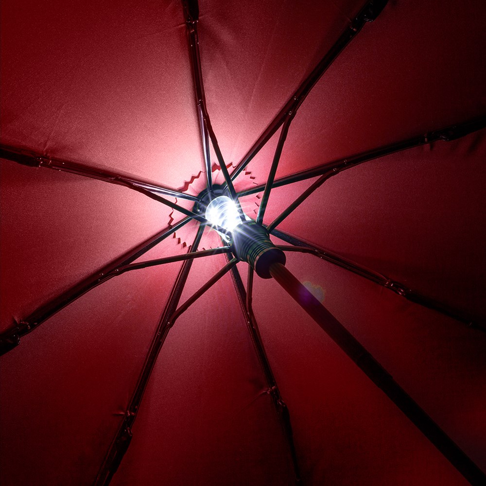 Effektvoller Taschenschirm mit LED-Innenbeleuchtung und Aufhängefunktion Einfache Handhabung durch Sicherheitsschieber, hochwertiges Windproof-PLUS-System für eine maximale Gestell-Flexibilität bei stärkeren Windböen, Soft-Feel-Griff mit abnehmbarer Trageschlaufe in Bezugsfarbe und mit Werbeanbringungsmöglichkeit, Top mit Aufhängefunktion für Trageschlaufe zu Dekorationszwecken, einfaches An- und Ausschalten des Lichts am Sicherheitsschieber, WEEE-Reg.-Nr. DE 14360689, Batt-Reg.-Nr. DE 52803080, Batterien (1 x AAA) im Lieferumfang enthalten.