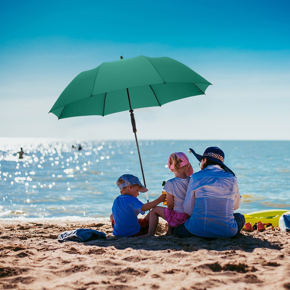 arretierbarer Unterstock, Bezug mit Lichtschutzfaktor UPF 50+, komfortables Tragefutteral, koffertauglich durch platzsparende Reisegröße, gastfreundlicher Durchmesser, auch als Regenschirm geeignet, exklusive Erdspieß (Art. 8939)