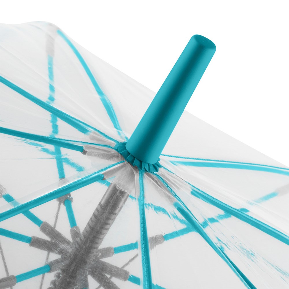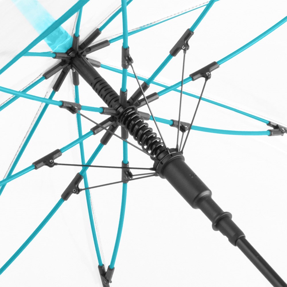 Ansprechender Automatik-Stockschirm mit transparentem Bezug und farbigen Details Komfortable Automatik-Funktion zum schnellen Öffnen, hochwertiges Windproof-PLUS-System für eine maximale Gestell-Flexibilität bei stärkeren Windböen, flexible Fiberglasschienen, farblich aufeinander abgestimmte Design-Elemente, handsympathischer Soft-Touch-Rundhakengriff mit integrierter Auslösetaste und Werbeanbringungsmöglichkeit, höherer Korrosionsschutz durch schwarze Galvanisierung des Stahlstocks