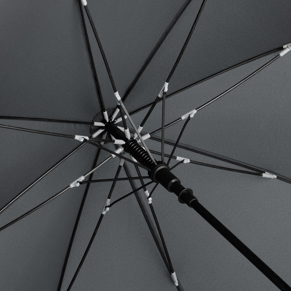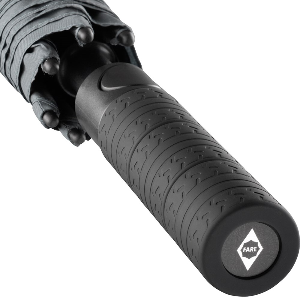 Exklusiver Automatik-Golf-/Gästeschirm für zwei Personen mit Reifenprofil-Design-Elementen Komfortable Automatik-Funktion zum schnellen Öffnen, hochwertiges Windproof-PLUS-System für eine maximale Gestell-Flexibilität bei stärkeren Windböen, flexible Fiberglasschienen mit grauen Gelenken, handsympathischer Soft-Feel-Griff im Reifenprofil-Design mit integrierter Auslösetaste und Werbeanbringungsmöglichkeit. Auch als Taschenschirm (Art. 5455) erhältlich.