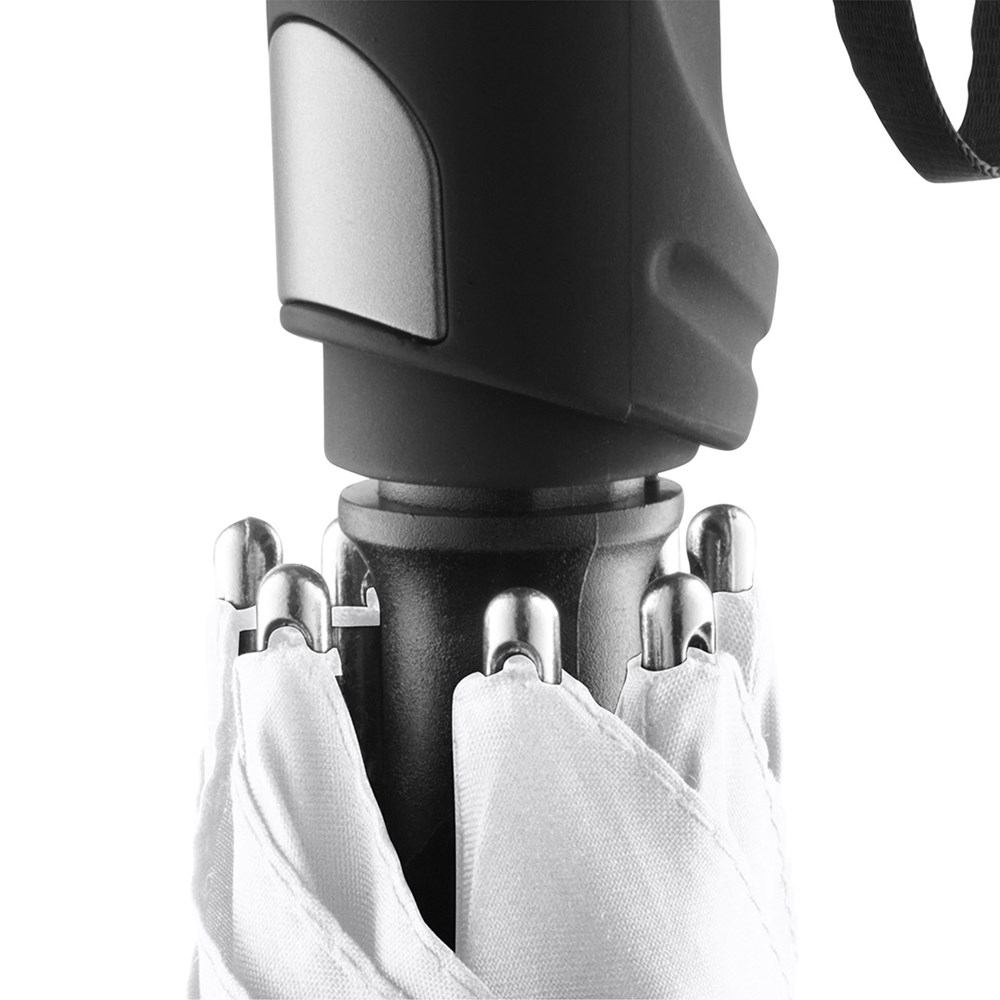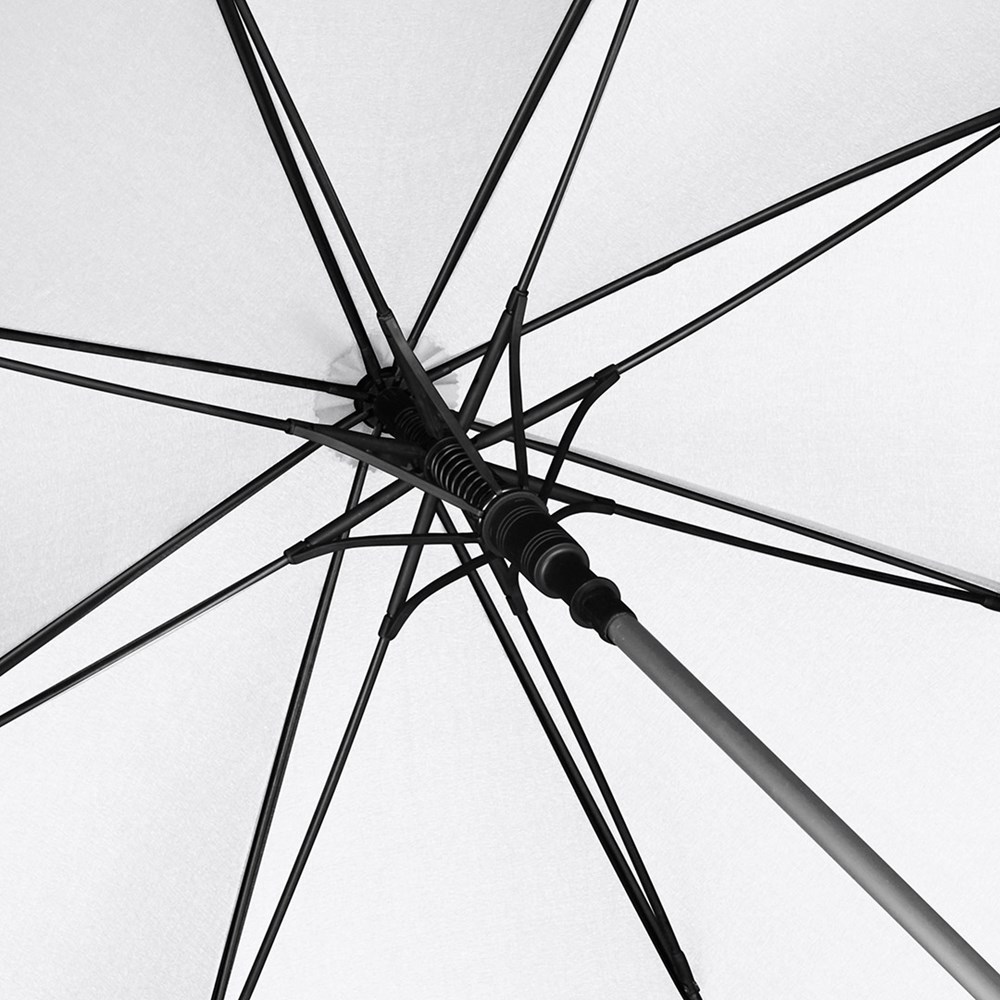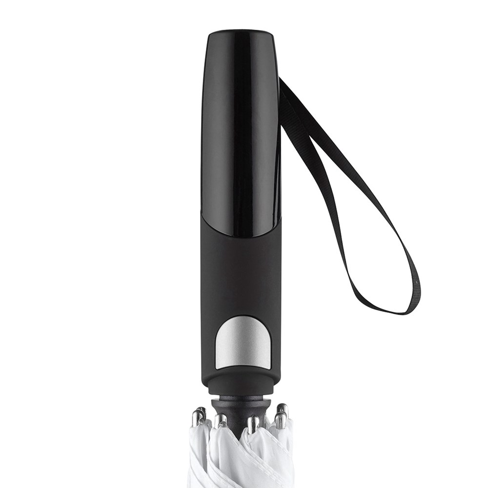 Edler Automatik-Gästeschirm für zwei Personen mit Elementen in Metallic-Farben Komfortable Automatik-Funktion zum schnellen Öffnen, hochwertiges Windproof-PLUS-System für eine maximale Gestell-Flexibilität bei stärkeren Windböen, flexible Fiberglasschienen, Aluminiumstock in matter Metallic-Farbe, Metall-Spitzen und Metall-Druckknopf am Schließband farblich passend zum Stock, matt/glänzend abgesetzter Soft-Feel-Griff mit integrierter Auslösetaste und Werbeanbringungsmöglichkeit