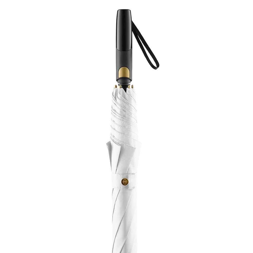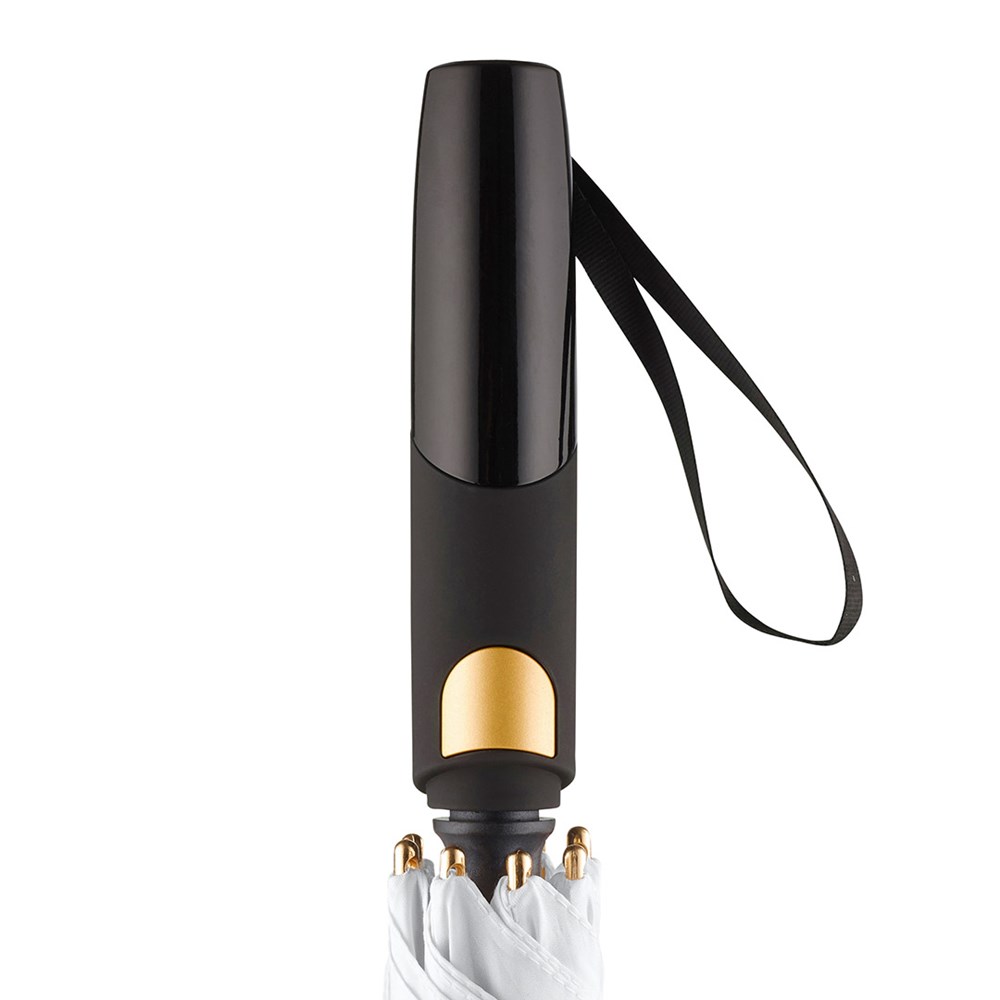 Edler Automatik-Gästeschirm für zwei Personen mit Elementen in Metallic-Farben Komfortable Automatik-Funktion zum schnellen Öffnen, hochwertiges Windproof-PLUS-System für eine maximale Gestell-Flexibilität bei stärkeren Windböen, flexible Fiberglasschienen, Aluminiumstock in matter Metallic-Farbe, Metall-Spitzen und Metall-Druckknopf am Schließband farblich passend zum Stock, matt/glänzend abgesetzter Soft-Feel-Griff mit integrierter Auslösetaste und Werbeanbringungsmöglichkeit