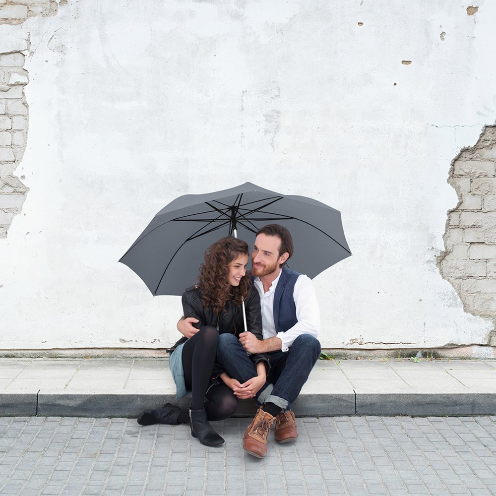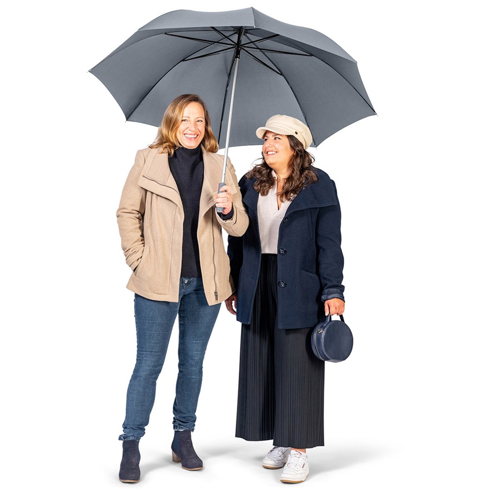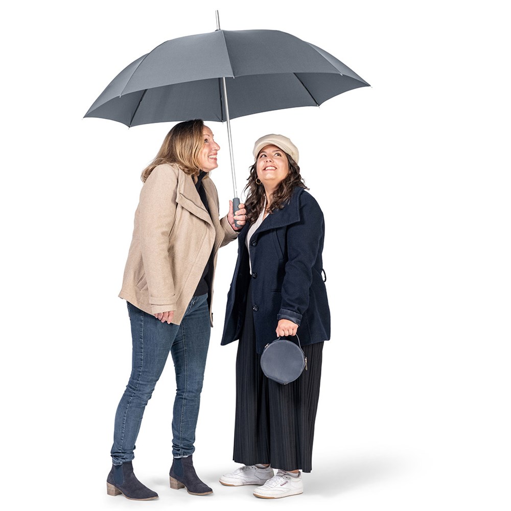 Stylischer Automatik-Gästeschirm für zwei Personen mit farblich auf den Bezug abgestimmtem Griff Komfortable Automatik-Funktion zum schnellen Öffnen, hochwertiges Windproof-PLUS-System für eine maximale Gestell-Flexibilität bei stärkeren Windböen, flexible Fiberglasschienen, leichter aber stabiler Aluminiumstock, formschöner Soft-Touch-Griff mit silberner Auslösetaste und Werbeanbringungsmöglichkeit, gastfreundlicher großer Durchmesser. Auch als Taschenschirm (Art. 5565, 5640) und als Stockschirm (Art. 7560) erhältlich.