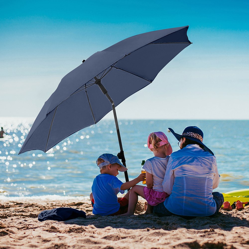 Moderner Sonnenschirm mit Gestell in Titan-Finish und Knickvorrichtung Einfache Handhabung durch Sicherheitsschieber, sehr stabile Fiberglasschienen, zweiteiliger und stufenlos höhenverstellbarer Stock mit Knickvorrichtung zur Neigung des Schirms, Stock in edlem Titan-Finish, Unterstock mit ca. 120 cm Länge und Drehfeststeller zur sicheren Fixierung, komfortables Tragefutteral, hochqualitativer Bezug mit einer Grammatur von ca. 200 g/m² und Lichtschutzfaktor UPF 50+, exklusive Füllständer (Art. 8920 oder Art. 8905) / Erdspieß (Art. 8939)
