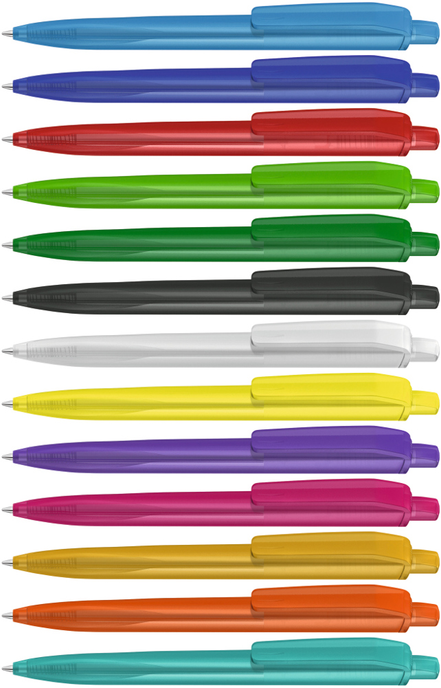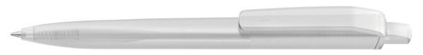 Druckkugelscheiber mit transparent gefrostetem Gehäuse, Clip und Drücker aus recyceltem ABS Kunststoff. Griffzone ergonomisch geformt.