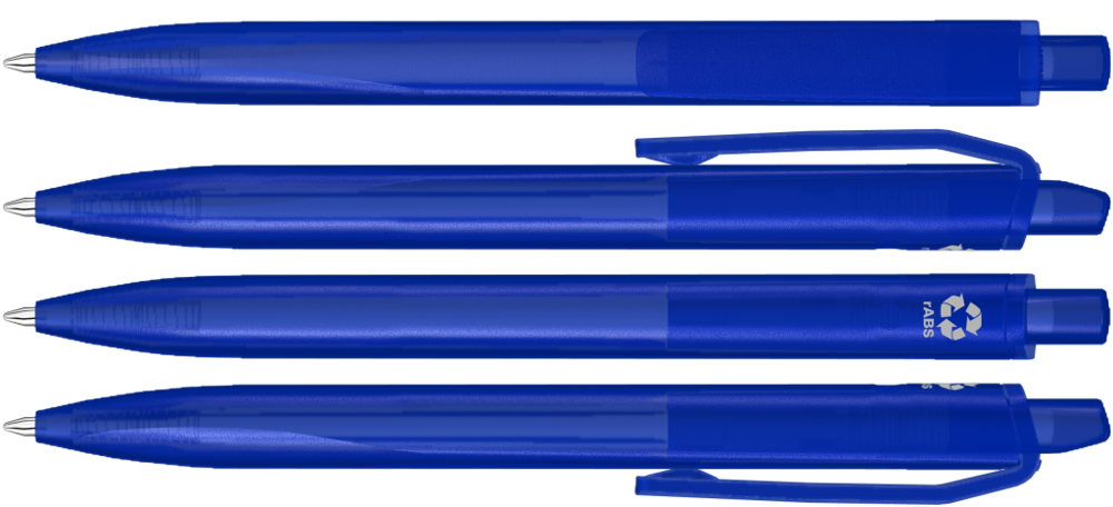 Druckkugelscheiber mit transparent gefrostetem Gehäuse, Clip und Drücker aus recyceltem ABS Kunststoff. Griffzone ergonomisch geformt.