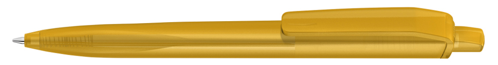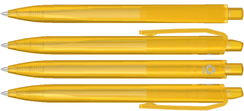 Druckkugelscheiber mit transparent gefrostetem Gehäuse, Clip und Drücker aus recyceltem ABS Kunststoff. Griffzone ergonomisch geformt.