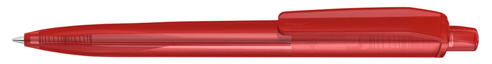 Druckkugelscheiber mit transparent gefrostetem Gehäuse, Clip und Drücker aus recyceltem ABS Kunststoff. Griffzone ergonomisch geformt.