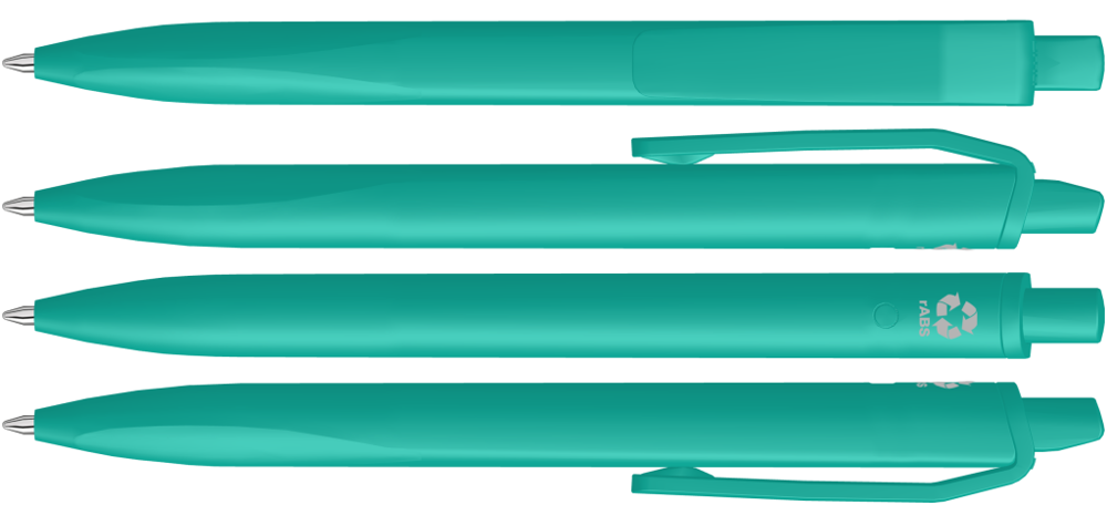Druckkugelscheiber mit gedeckt mattem Gehäuse, Clip und Drücker aus recyceltem ABS-Kunststoff. Griffzone ergonomisch geformt.