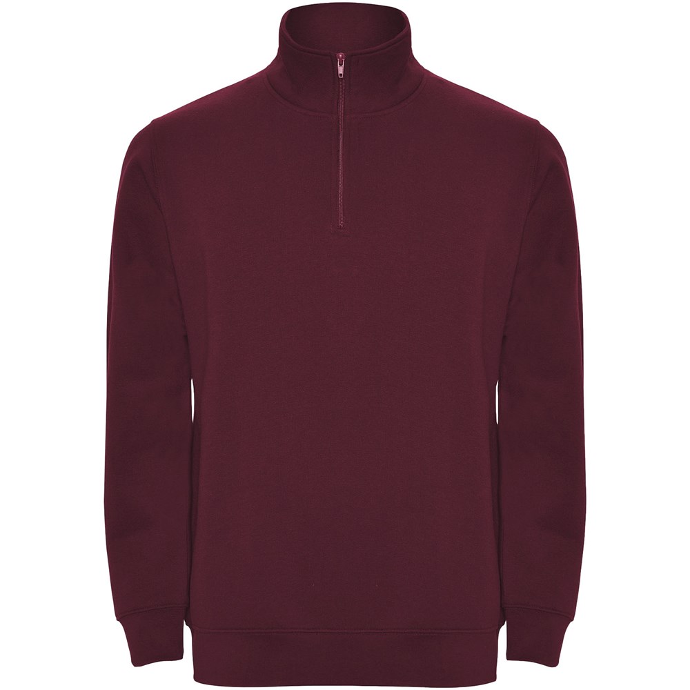 Sweatshirt mit passendem halben Reißverschluss und Polokragen. Passender Innenkragen. Verstärkte, abgedeckte Nähte am Innenkragen. 1×1 Rippbündchen an Ärmeln und Taille. Das Modell ist 185 cm groß und trägt Größe M.