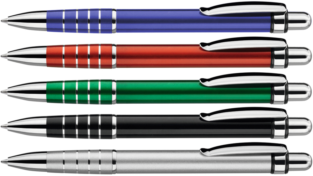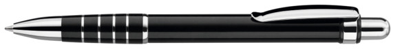 Metall-Druckkugelschreiber mit lackiertem Aluminiumschaft, Metallclip und Griffzone mit Ringdesign glanzverchromt.