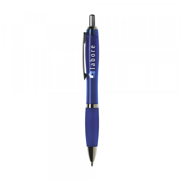 Blauschreibender oder schwarzschreibender Kugelschreiber mit transparentfarbener Gehäuse, grifffestem Vorderteil und Metallclip.