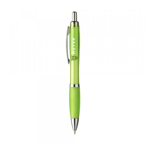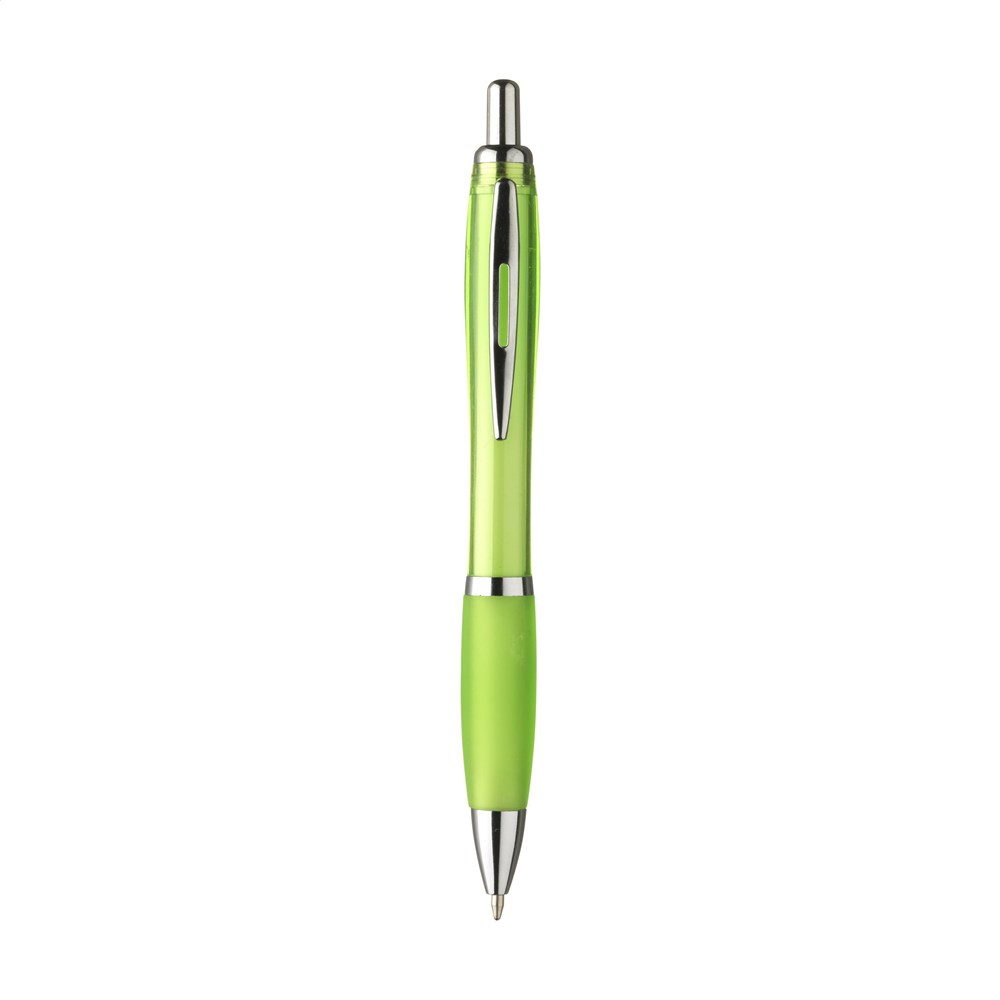 Blauschreibender oder schwarzschreibender Kugelschreiber mit transparentfarbener Gehäuse, grifffestem Vorderteil und Metallclip.