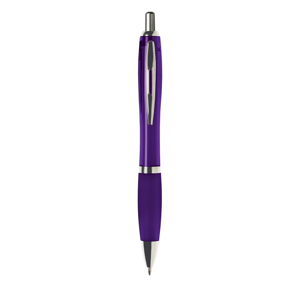 Blauschreibender oder schwarzschreibender Kugelschreiber mit transparentfarbener Gehäuse, grifffestem Vorderteil und Metallclip.
