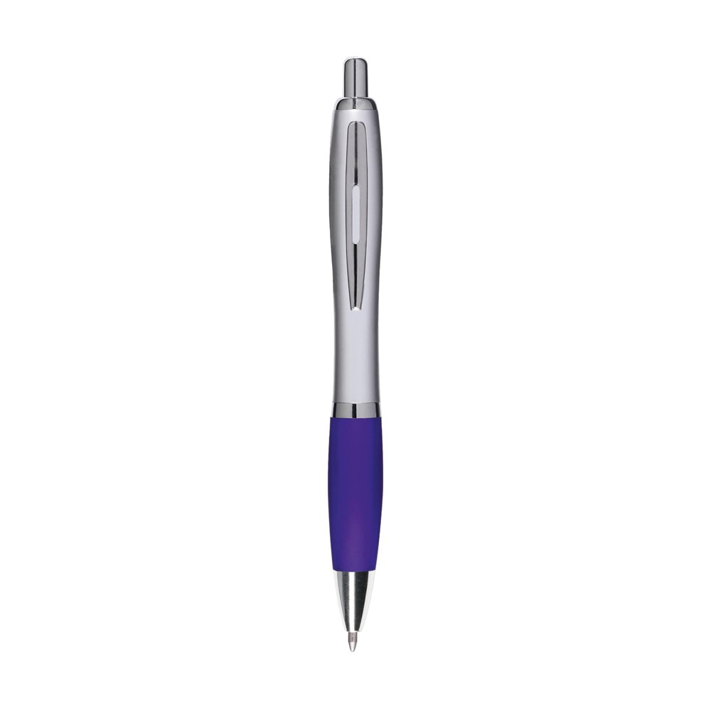 Blauschreibender Kugelschreiber mit farbigem, grifffestem Vorderteil und Metallclip.