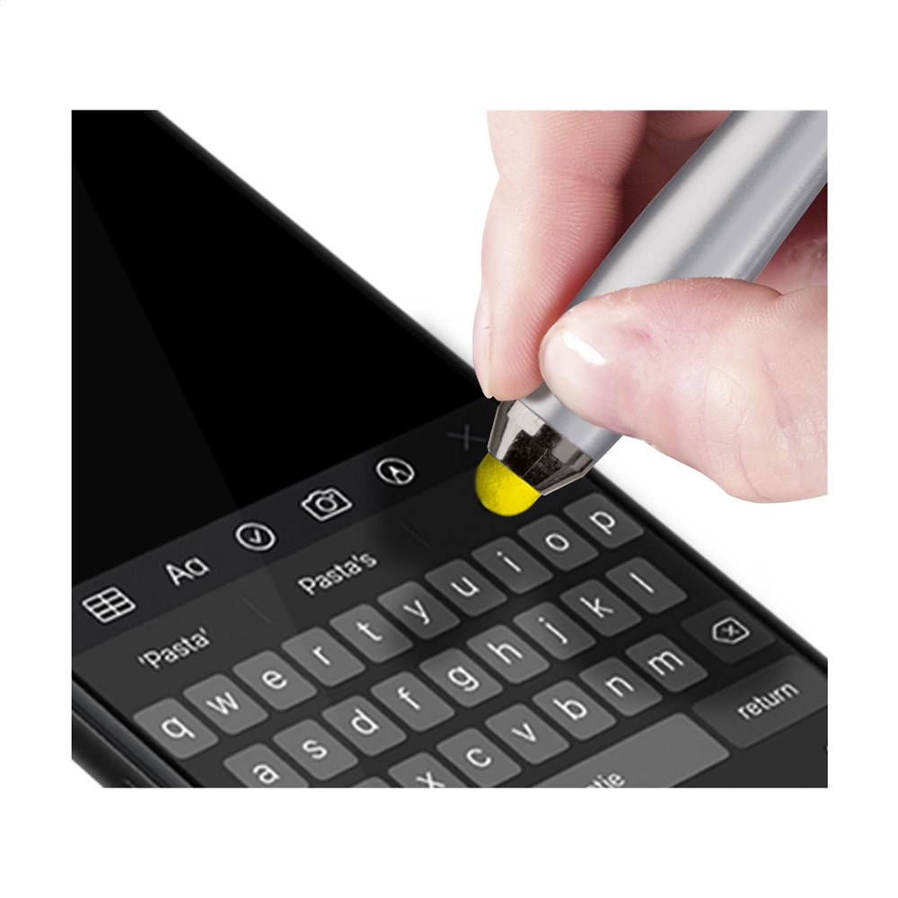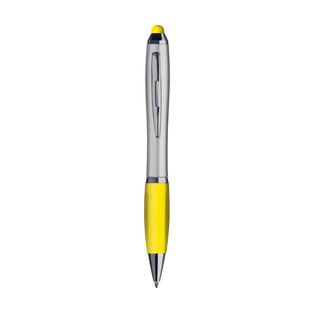 Blauschreibender Kugelschreiber mit farbiger, gummierter Spitze/Pointer zum Bedienen von Touchscreens (wie iPhone/iPad), hochglänzenden Akzenten, farbigem, grifffestem Vorderteil, Aussparungen im Metallclip und Dreh-Klicksystem.