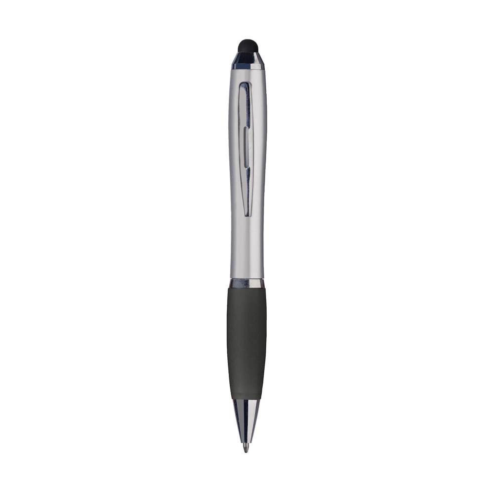 Blauschreibender Kugelschreiber mit farbiger, gummierter Spitze/Pointer zum Bedienen von Touchscreens (wie iPhone/iPad), hochglänzenden Akzenten, farbigem, grifffestem Vorderteil, Aussparungen im Metallclip und Dreh-Klicksystem.
