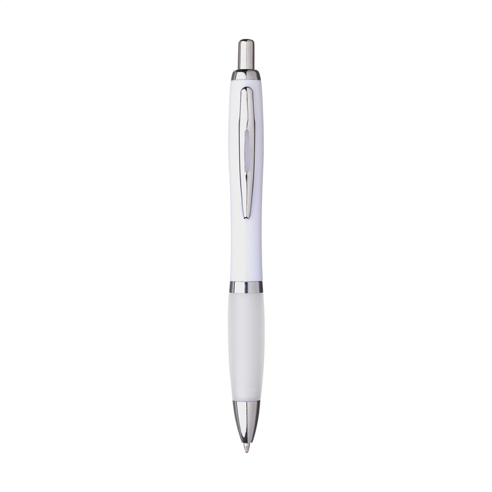 Blauschreibender Kugelschreiber. Das transparent farbiges Gehäuse besteht aus recyceltem ABS. Mit Druckknopf, Metallclip und silberfarbenen Akzenten. RCS-zertifiziert. Recyceltes Material insgesamt: 78%.