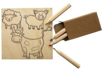 mit 3 niedlichen Tiermotiven, die auch als Streuteile verwendet werden können. Aus naturbelassenem Birkensperrholz, FSC zertifiziert. Inklusive 4 Holzbuntstiften (blau, rot, grün, gelb). Verpackt in Papiertüte. Maße 9,2 x 9,2cm. VE 200/1 Stück.