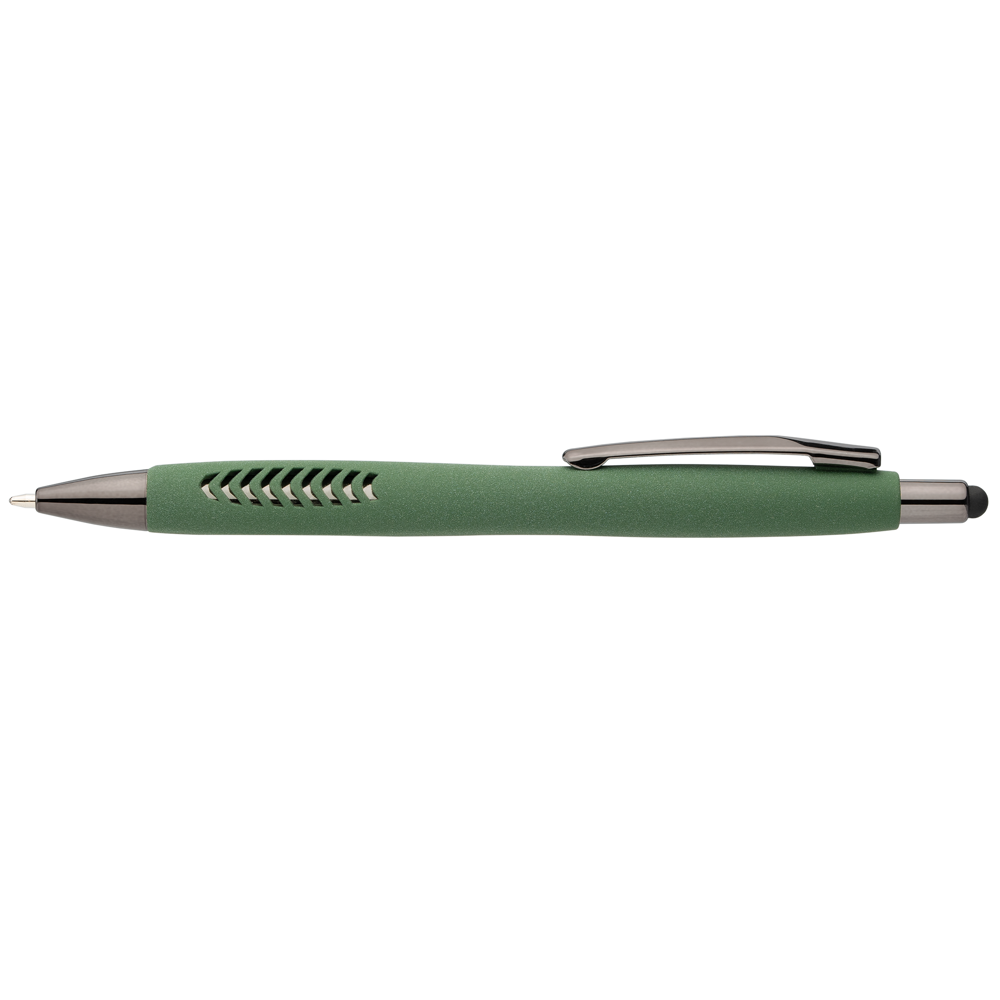**Demnächst verfügbar – Ende Januar** Wir präsentieren Ihnen unseren Avalon Kugelschreiber mit Stylus, ein modernes Schreibgerät mit hochwertigen Funktionen und einem von der Natur inspirierten Design. Der Schaft dieses Kugelschreibers besteht aus recyceltem Kunststoff (rABS) und verfügt über eine einzigartige Steinoberfläche. Der Griff ist mit stilvollen Chevron-Ausschnitten versehen, die für mehr Komfort und Kontrolle sorgen. Abgerundet wird die Ästhetik des Kugelschreibers durch dunkle, glänzende Gunmetal-Akzente an der Spitze und am Druckknopf, in den auch ein schwarzer Gummistylus für die Verwendung auf Touchscreens integriert ist. Der Avalon Kugelschreiber ist mit einer schwarzen, schlanken Dokumental-Tintenmine ausgestattet, die durch eine 1,0 mm Spitze ein angenehmes Schreibgefühl bietet und eine beeindruckende Schreiblänge von 600 Metern ermöglicht.